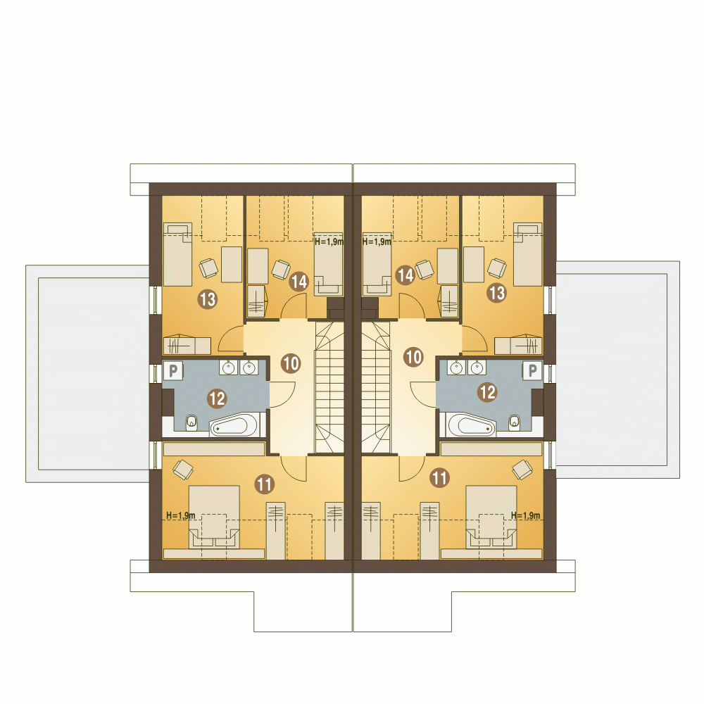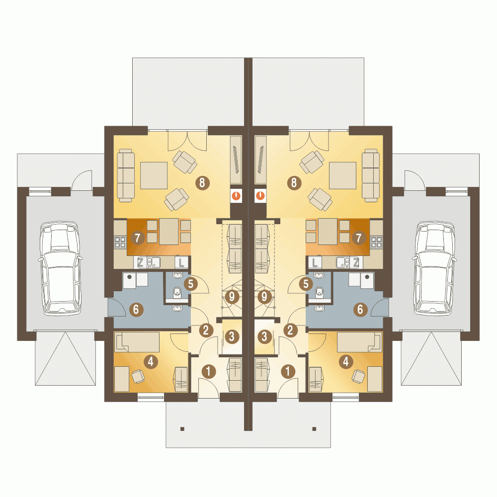 (Uwaga: projekty typu bliźniak oferujemy jako domy dwulokalowe, projekt można zamówić również w zabudowie bliźniaczej)Projekt Azalia z garażem A-BL1 (z dwiema ścianami dzielącymi segmenty budynku), to propozycja dla deweloperów i osób zainteresowanych domami dwulokalowymi. Budynek prosty w formie oraz proste rozwiązania konstrukcyjne gwarantują niski koszt jego budowy. Dzięki ciepłym barwom kolorystyce, projekt Azalia prezentuje się wyjątkowo atrakcyjnie, wyróżniając się kontrastowym zestawieniem kolorów. Funkcja budynku to dwie strefy: ogólnodostępna i prywatna. Na parterze mamy przewidziany wiatrołap, hol ze spiżarnią, pokój/gabinet, pomieszczenie gospodarcze - kotłownię, osobną toaletę, kuchnię z małą jadalnią i salon z kominkiem. Na poddasze prowadzą jednobiegowe schody. Tutaj przewidujemy wygodny przedpokój, wspólną obszerną łazienkę, 3 sypialnie w tym jedna z garderobą.