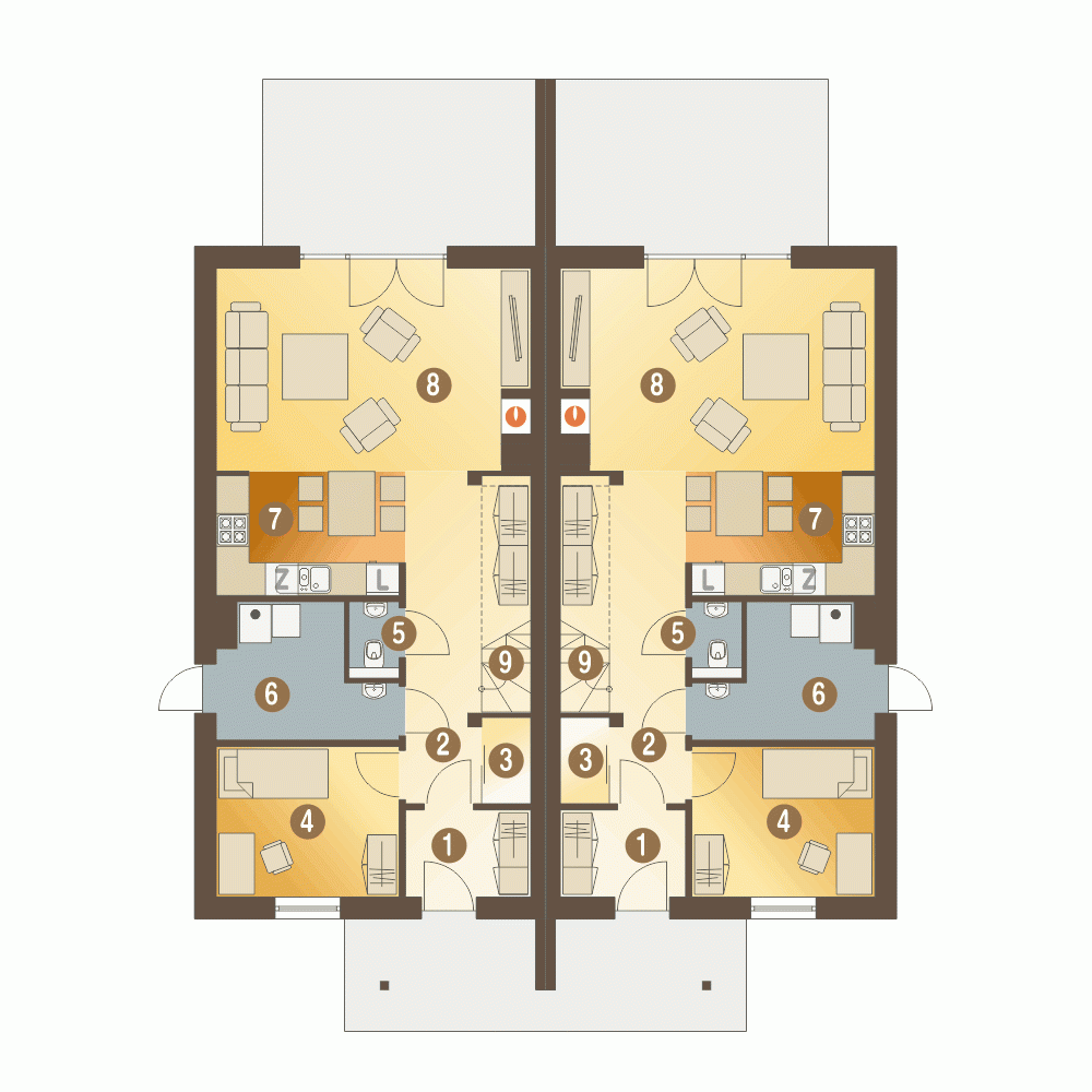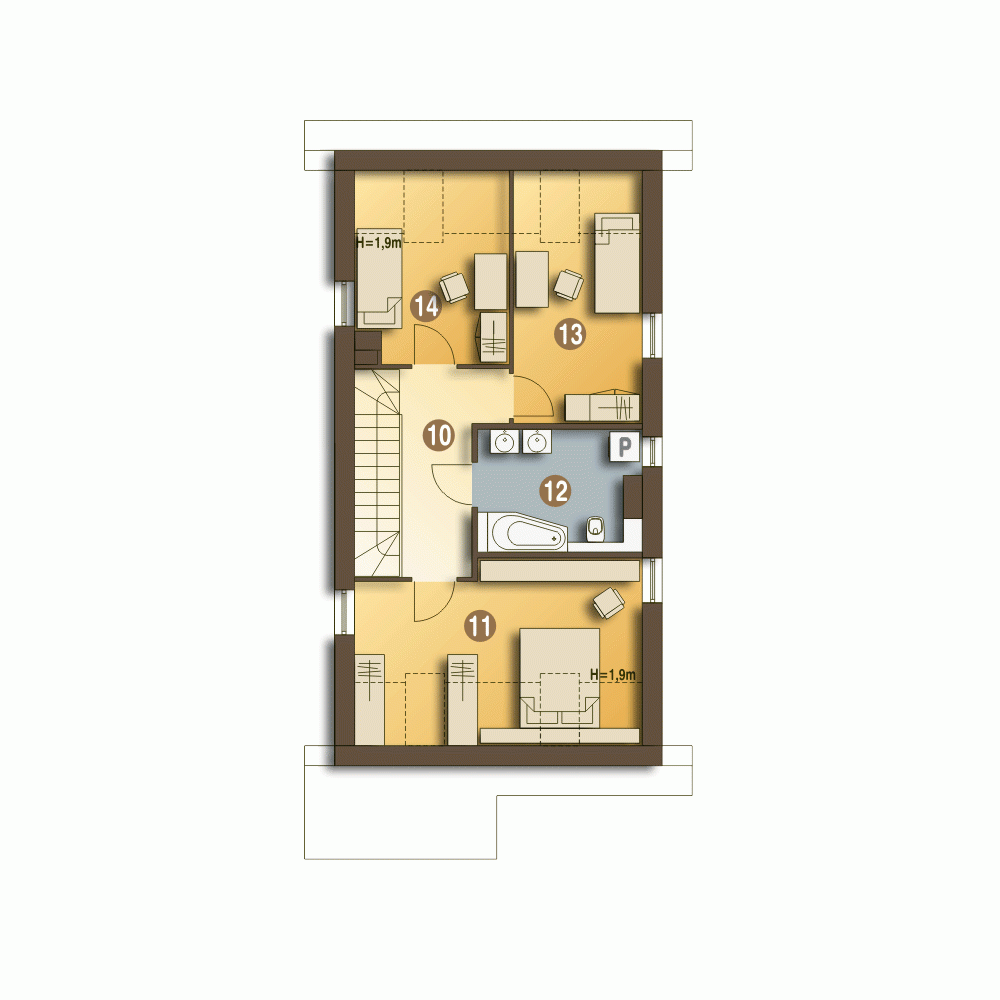 Projekt Azalia bez garażu, to propozycja domu o prostej formie i konstrukcji co gwarantuje niski koszt jego budowy. Dzięki ciepłym barwom, projekt Azalia prezentuje się wyjątkowo atrakcyjnie, wyróżniając się kontrastowym zestawieniem kolorów. Funkcja budynku obejmuje dwie strefy: ogólnodostępną i prywatną. Na parterze mamy przewidziany wiatrołap, hol, spiżarnię, pokój/gabinet, kotłownię, WC, kuchnię z małą jadalnią i salon z kominkiem. Na poddasze prowadzą drewniane schody. Przewidujemy tu wygodny przedpokój, wspólną obszerną łazienkę, 3 sypialnie w tym jedną z garderobą.