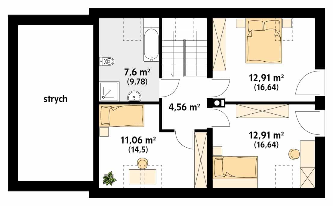 - rzuty poziome poszczególnych kondygnacji (parter, poddasze lub piętro),