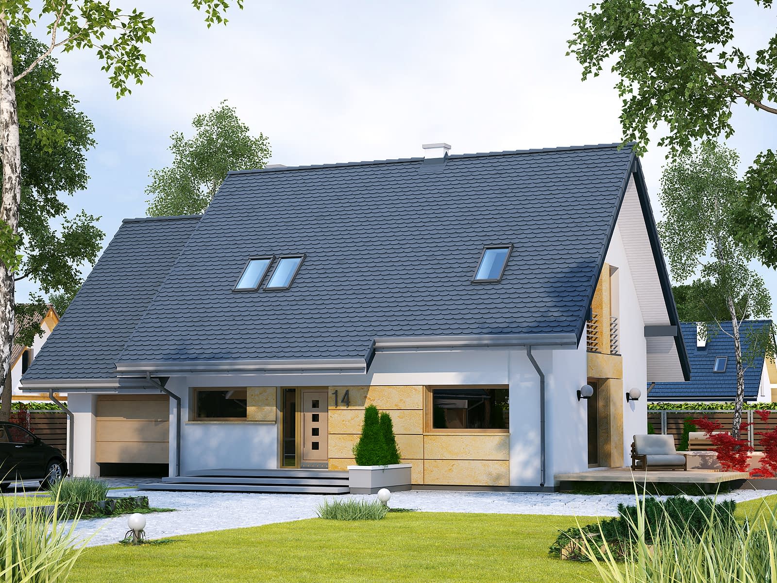 Ściany: 2-warstwowe - bloczek z betonu komórkowego SOLBET 24 cm + styropian, Stropy: żelbetowe, wylewane, Dach: dachówka ceramiczna CREATON,Rzuty