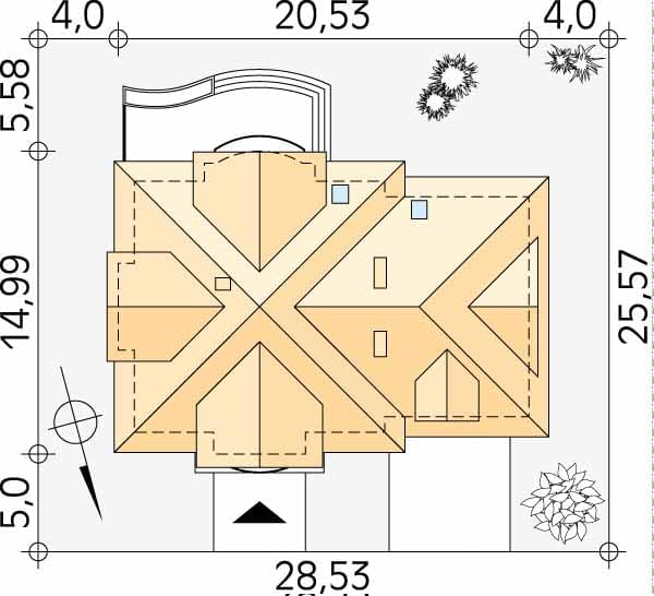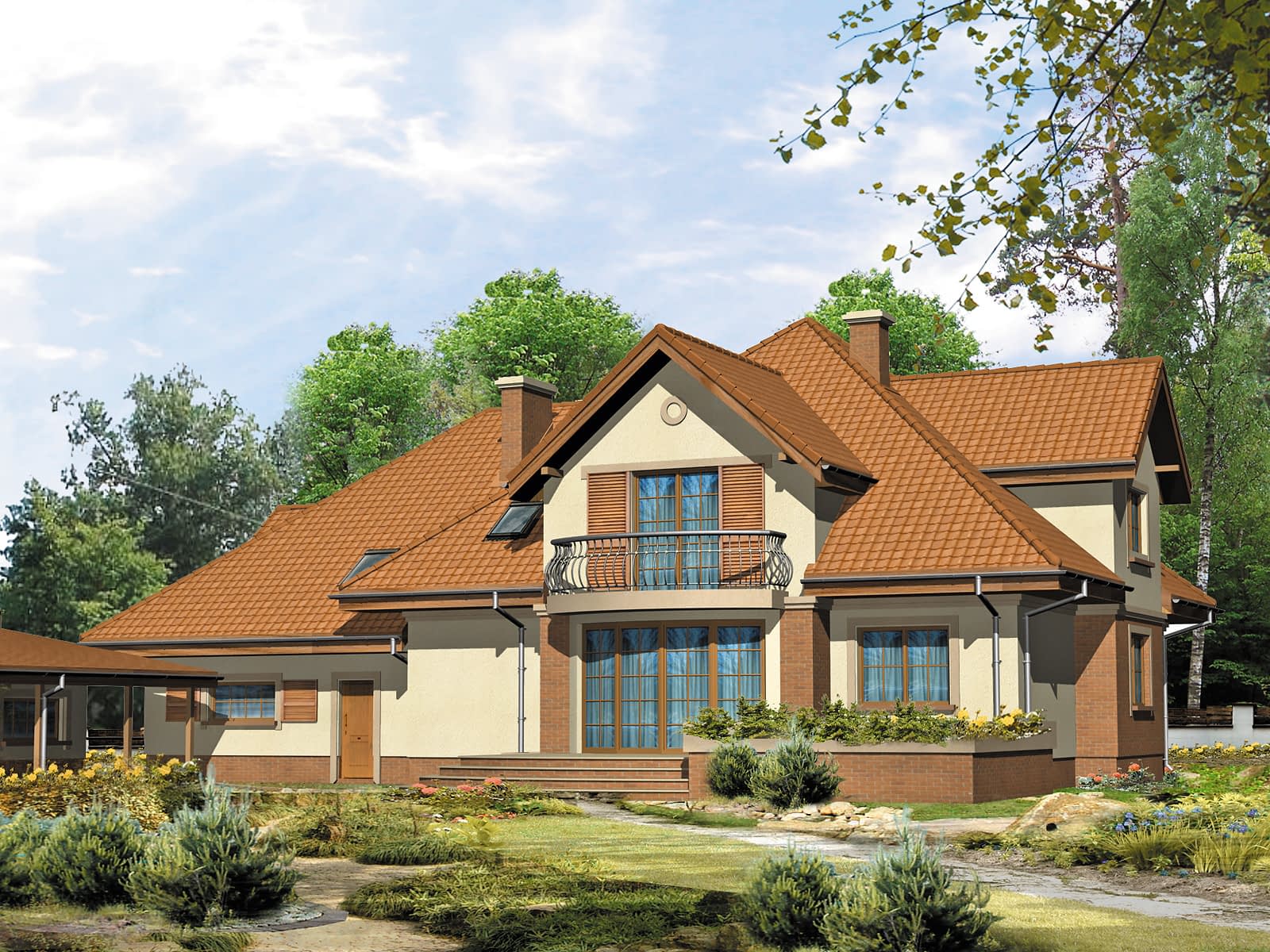 Dom mieszkalny jednorodzinny z użytkowym poddaszem, częściowo podpiwniczony z czterostanowiskowym garażem. Przeznaczony dla licznej rodziny. Z pokoju dziennego zaprojektowano wyjście na duży taras. Na poddaszu przewidziano pięć sypialni.Konstrukcja