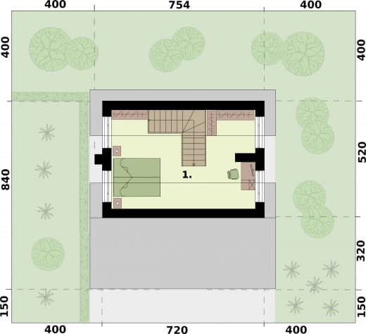 - powierzchnia zabudowy budynku (bez tarasu i schodów zewn.) -37,44m2