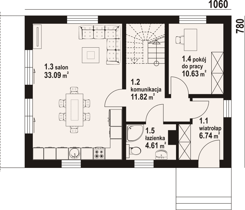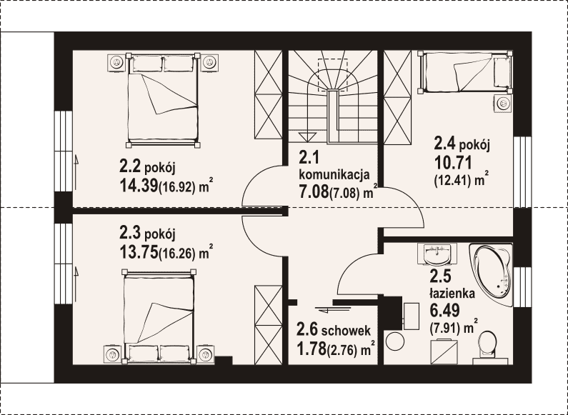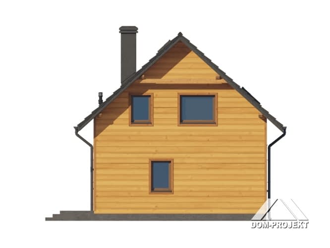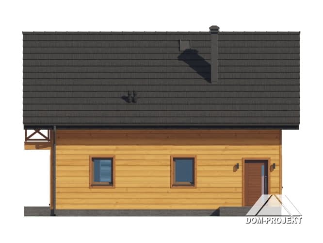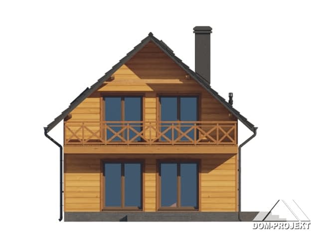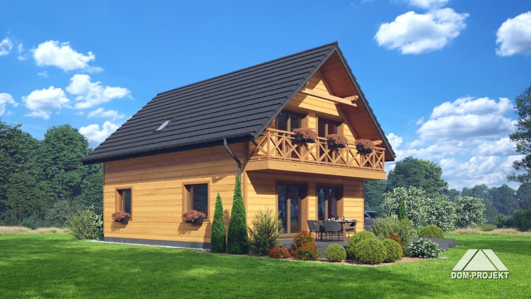 Dom w konstrukcji szkieletu drewnianego. Na parterze salon z aneksem kuchennym oraz wyjściem na taras. Pokój do pracy, komunikacja, łazienka, wiatrołap. Na poddaszu trzy pokoje, komunikacja, schowek, łazienka oraz balkon dostępny z dwóch pokoi. Zwarta bryła budynku oraz dach dwuspadowy sprzyjają szybkiej i taniej budowie oraz niskim kosztom eksploatacji.Rzuty