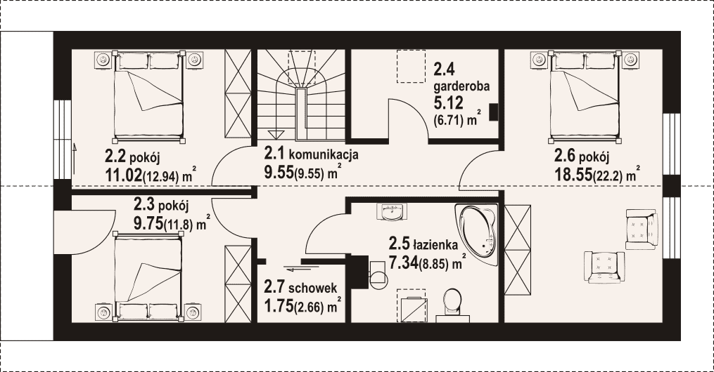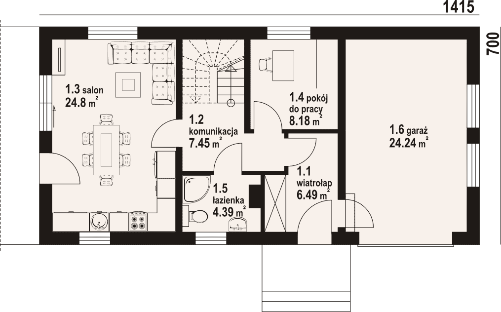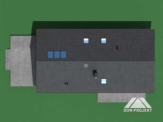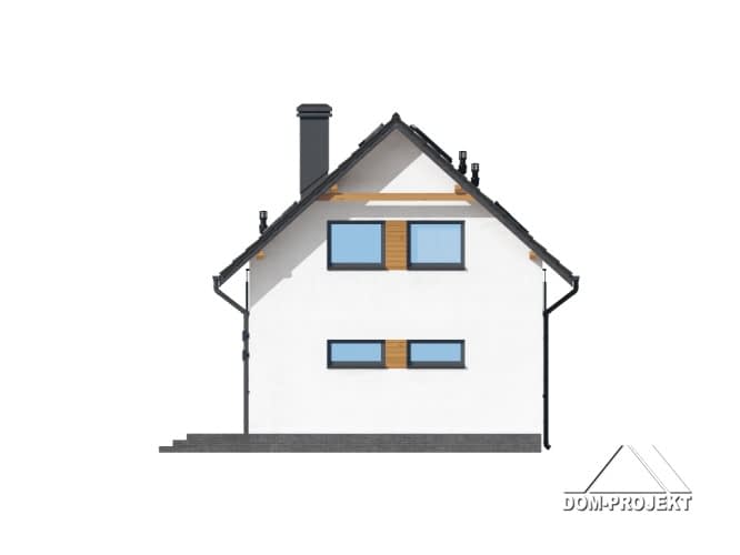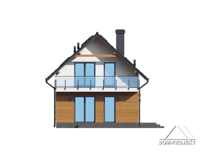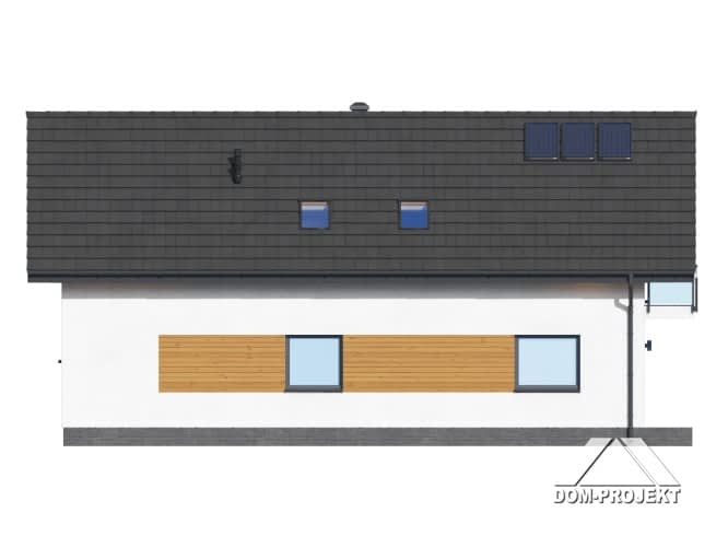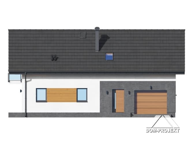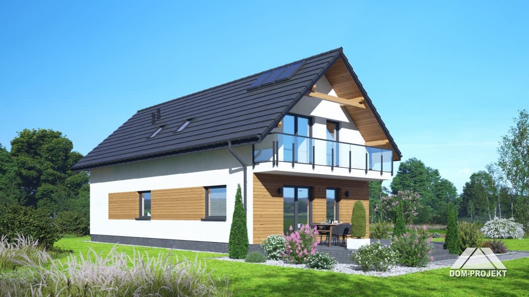 Dom z poddaszem użytkowym. Na parterze salon z aneksem kuchennym oraz wyjściem na taras. Pokój do pracy, komunikacja, łazienka, wiatrołap, garaż. Na poddaszu trzy pokoje, łazienka, garderoba, schowek, komunikacja oraz balkon dostępny z dwóch pokoi. Zwarta bryła budynku oraz dach dwuspadowy sprzyjają szybkiej i taniej budowie oraz niskim kosztom eksploatacji.Rzuty