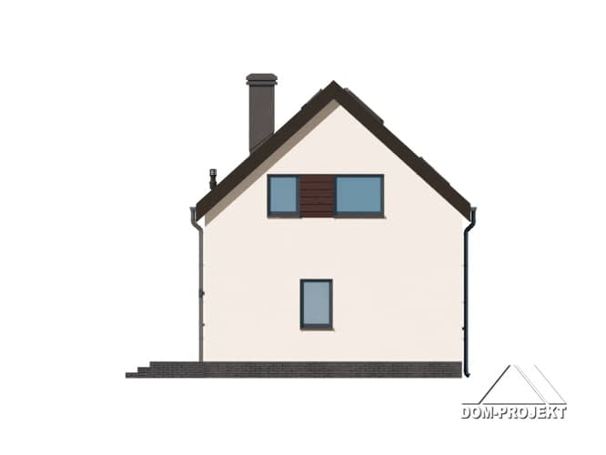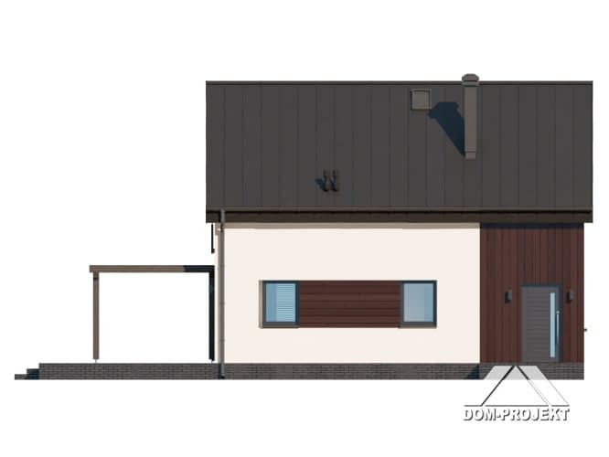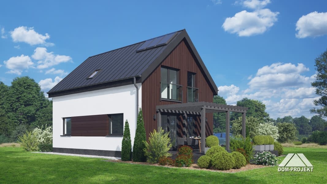Dom z poddaszem użytkowym. Na parterze salon z aneksem kuchennym oraz wyjściem na taras. Pokój do pracy, łazienka, komunikacja, wiatrołap. Na poddaszu trzy pokoje, łazienka, schowek, komunikacja. Zwarta bryła budynku oraz dach dwuspadowy sprzyjają szybkiej i taniej budowie oraz niskim kosztom eksploatacji.Rzuty