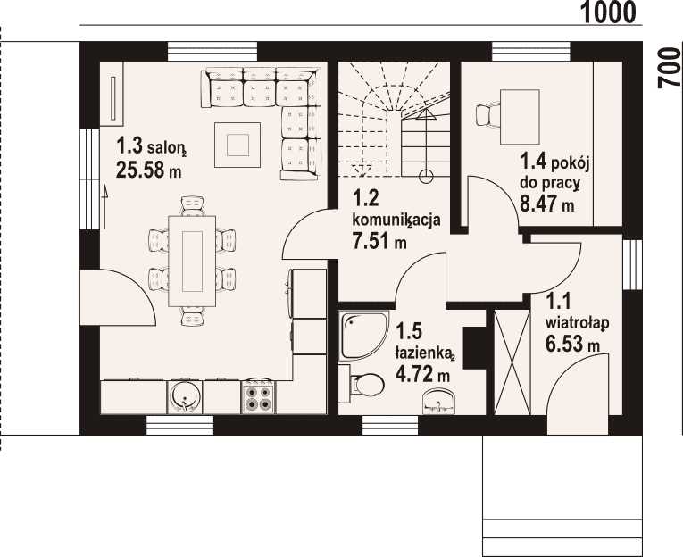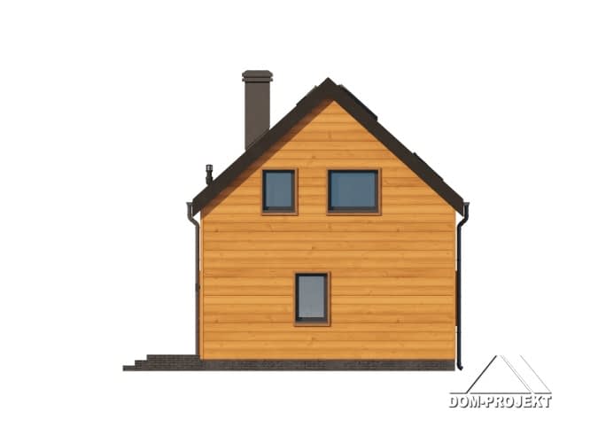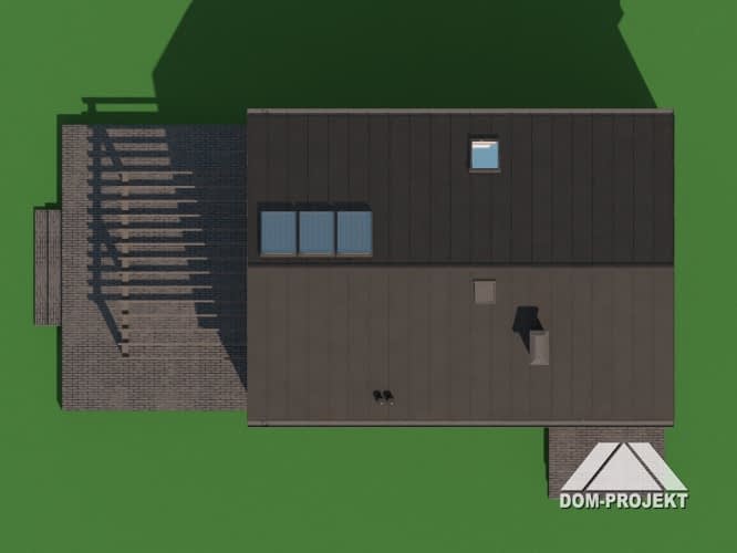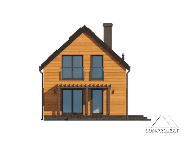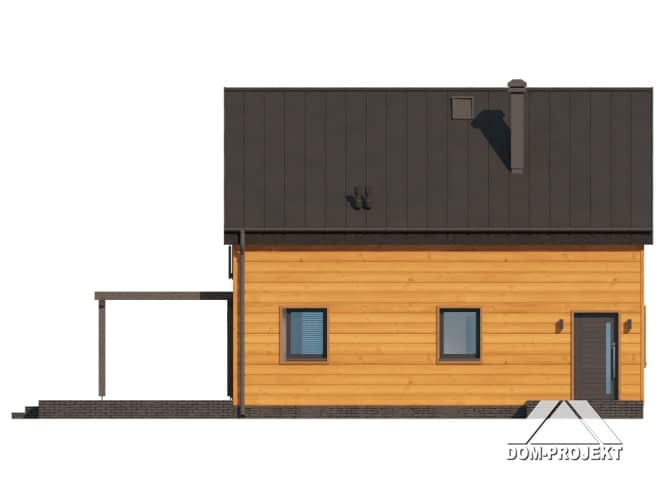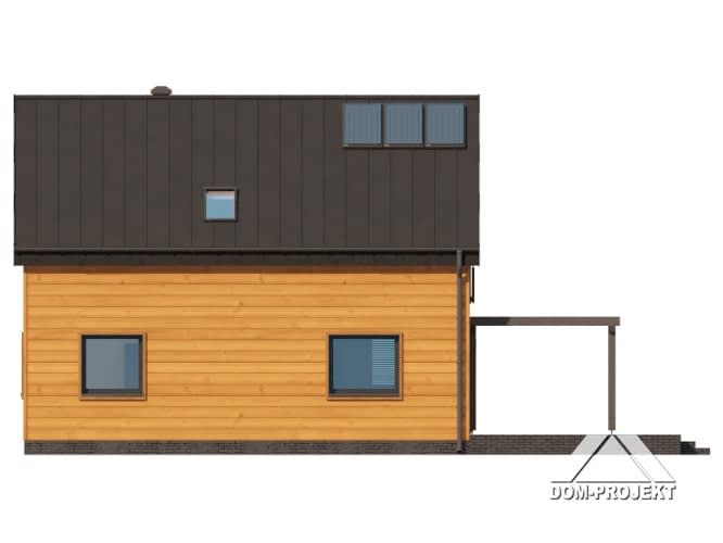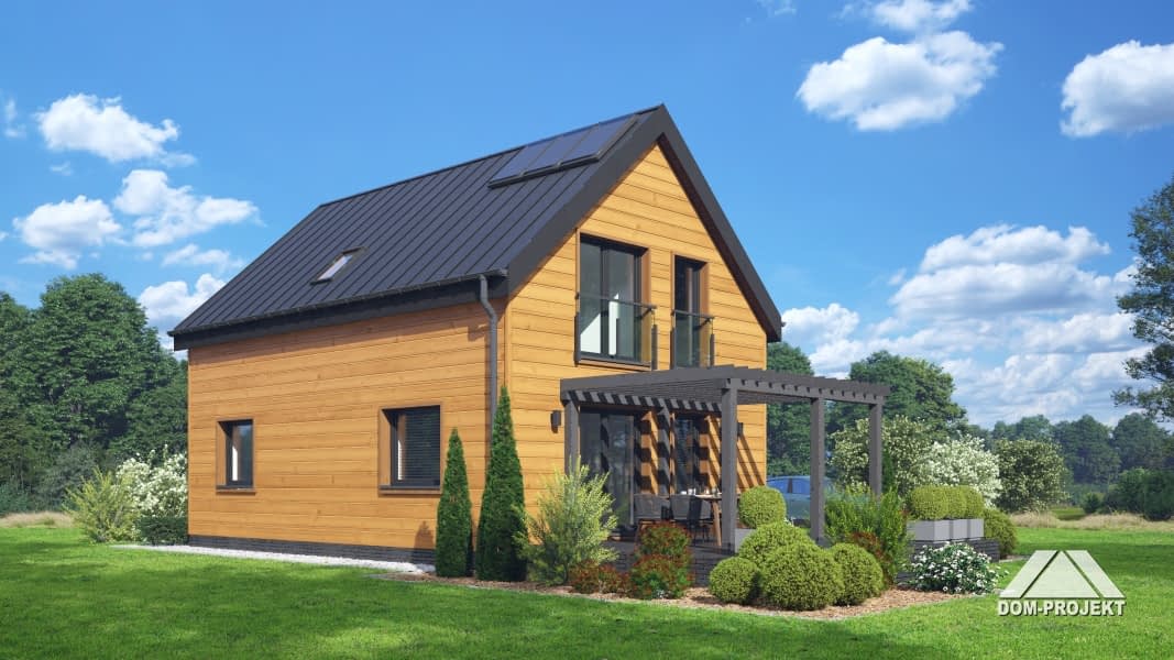 Dom w konstrukcji szkieletu drewnianego. Na parterze salon z aneksem kuchennym oraz wyjściem na taras. Pokój do pracy, łazienka, komunikacja, wiatrołap. Na poddaszu trzy pokoje, komunikacja, schowek, łazienka. Zwarta bryła budynku oraz dach dwuspadowy sprzyjają szybkiej i taniej budowie oraz niskim kosztom eksploatacji.Rzuty