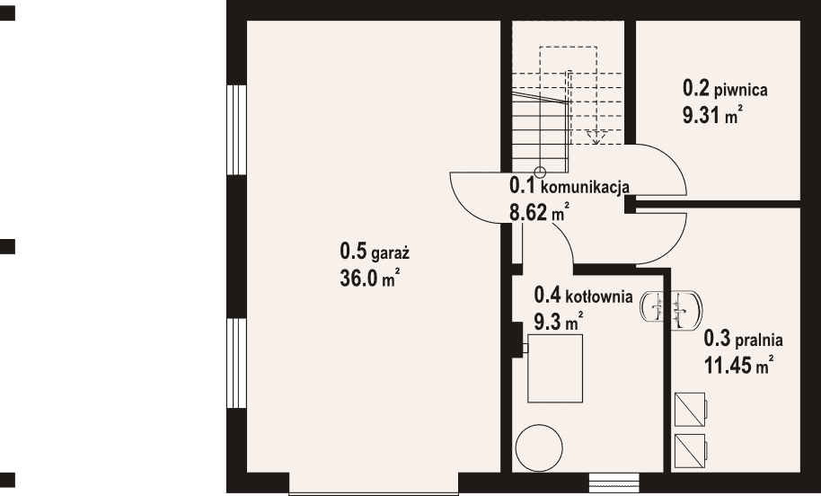 Dom z poddaszem i podpiwniczeniem. Na parterze duży salon z aneksem kuchennym i wyjściem na duży taras. Pokój, łazienka, komunikacja i wiatrołap. Na poddaszu cztery pokoje, łazienka i komunikacja. W piwnicach garaż, piwnica, pralnia, kotłownia i komunikacja. Zwarta bryła budynku sprzyja szybkiej i taniej budowie i niskim kosztom eksploatacji.Rzuty