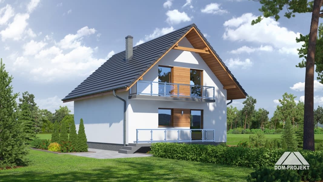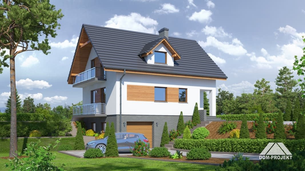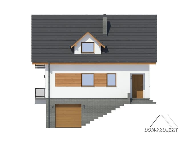 Dom dla 4-5 osobowej rodziny. Duży salon z aneksem kuchennym, kominkiem i wyjściem na balkon. Pokój, łazienka, komunikacja i wiatrołap. Na poddaszu trzy pokoje, łazienka, komunikacja i balkon. W piwnicach garaż, kotłownia, piwnica i komunikacja. Zwarta bryła budynku i dach dwuspadowy sprzyjają taniej i szybkiej budowie i niskim kosztom eksploatacji.Rzuty