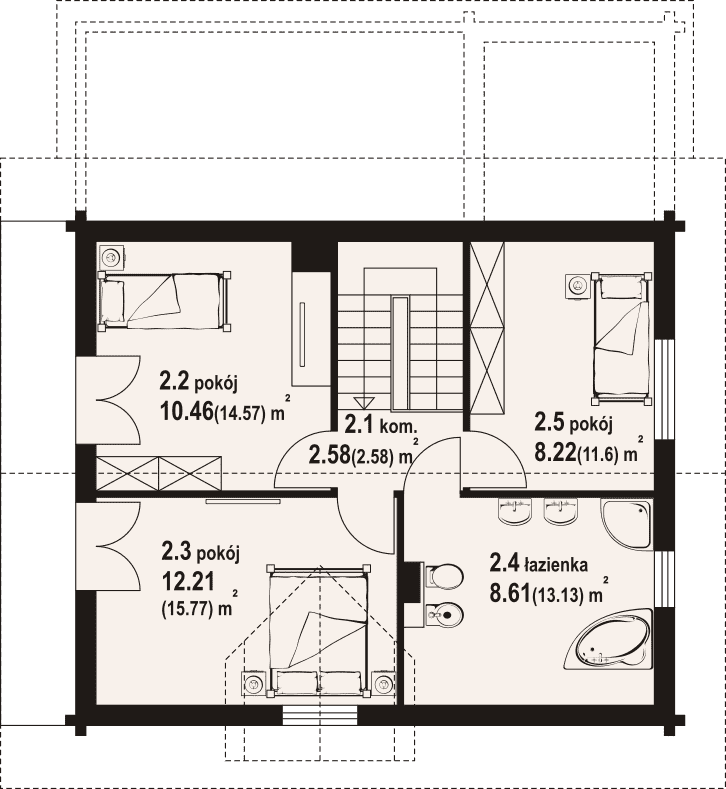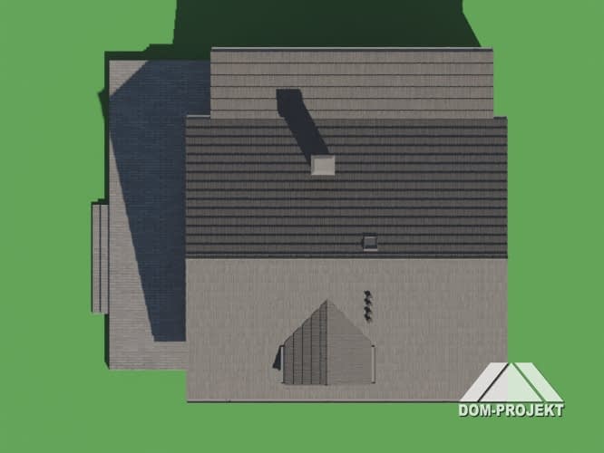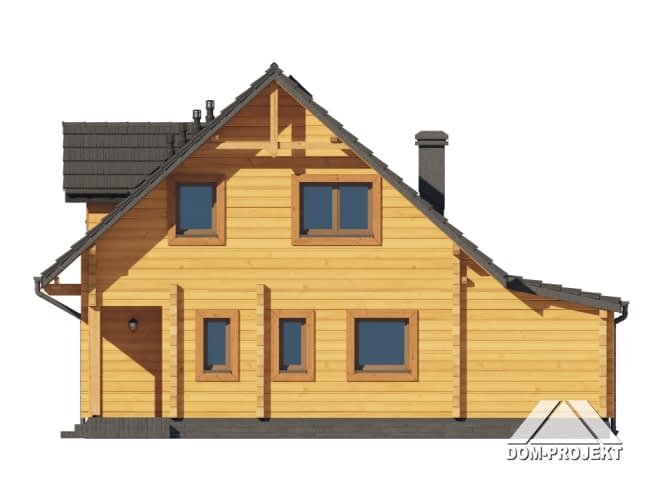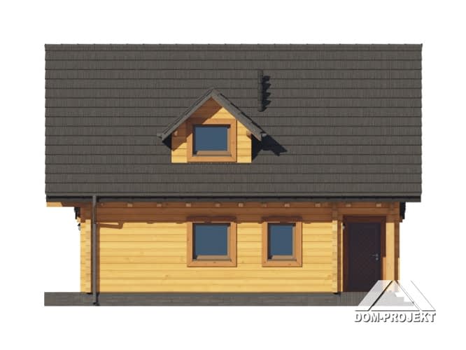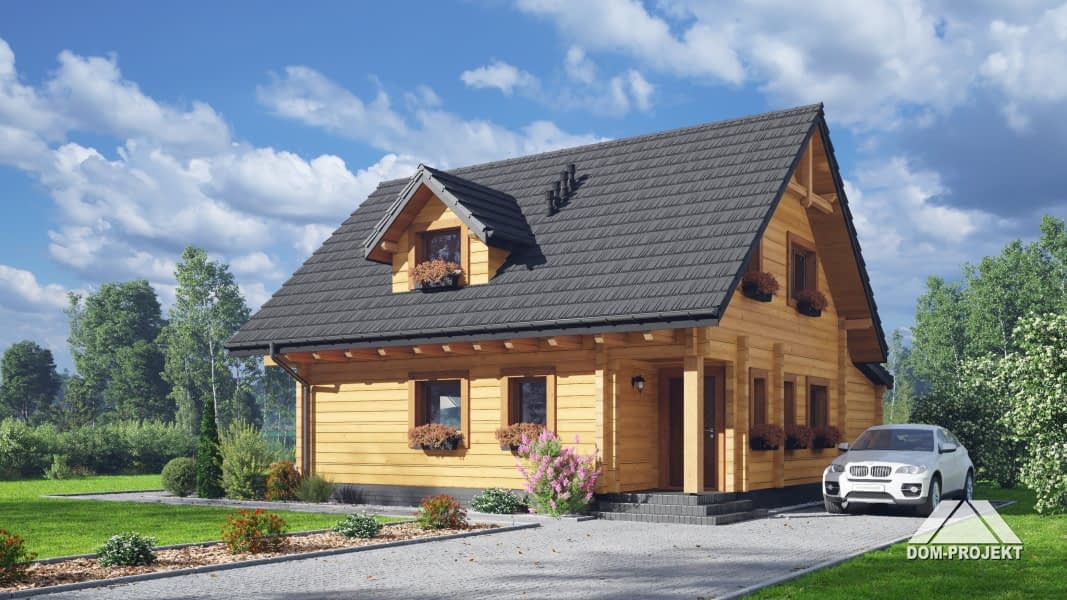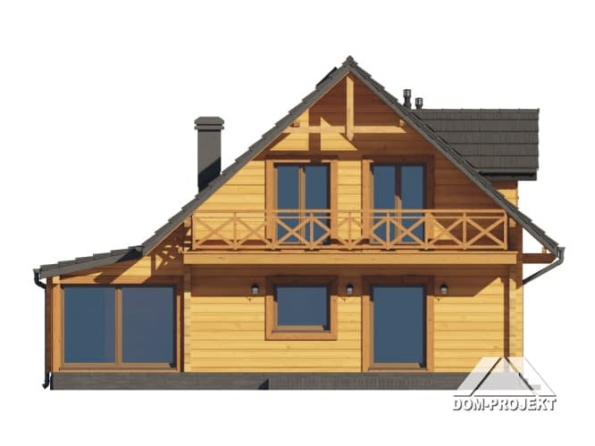 Dom z bali. Na parterze salon z aneksem kuchennym, wyjściem na taras oraz przejściem do ogrodu zimowego. W ogrodzie zimowym kominek. Pokój, łazienka, komunikacja, wiatrołap, pomieszczenie gospodarcze. Na poddaszu trzy pokoje, łazienka, komunikacja. Zwarta bryła budynku i dach dwuspadowy sprzyjają szybkiej i taniej budowie.Rzuty