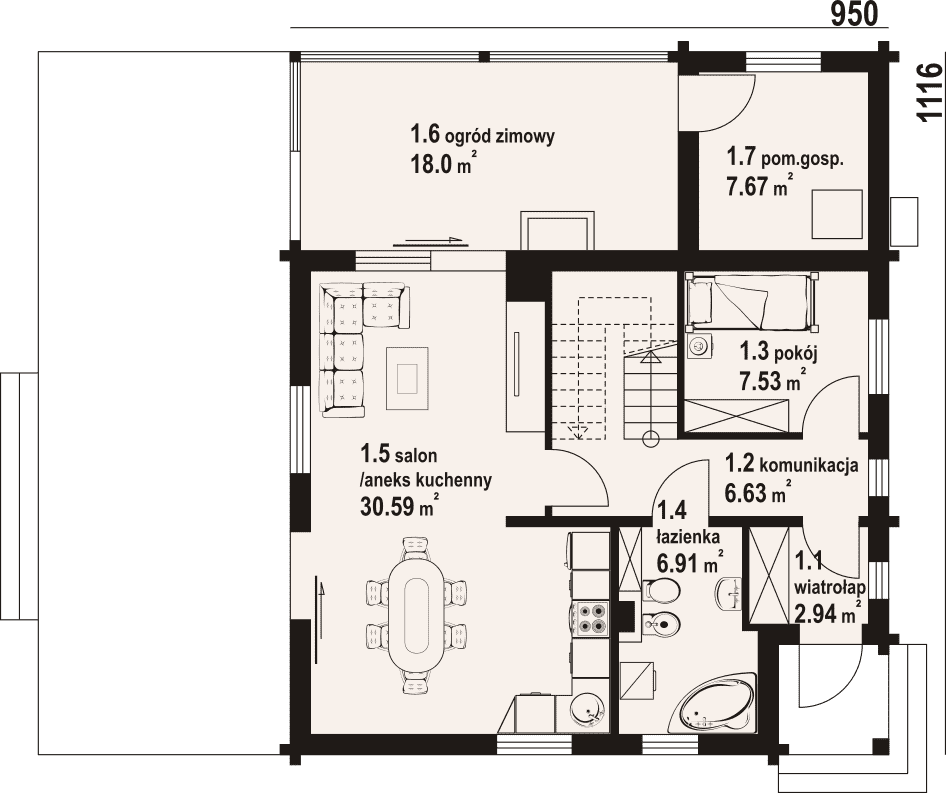 - 1.5 - salon z aneksem kuchennym30.59 m²