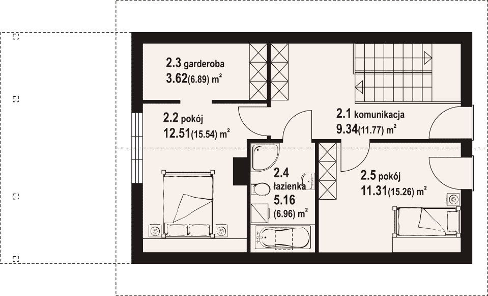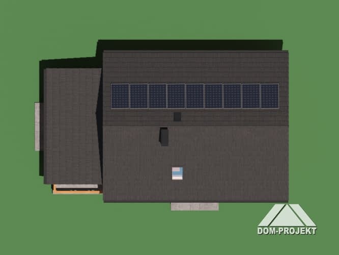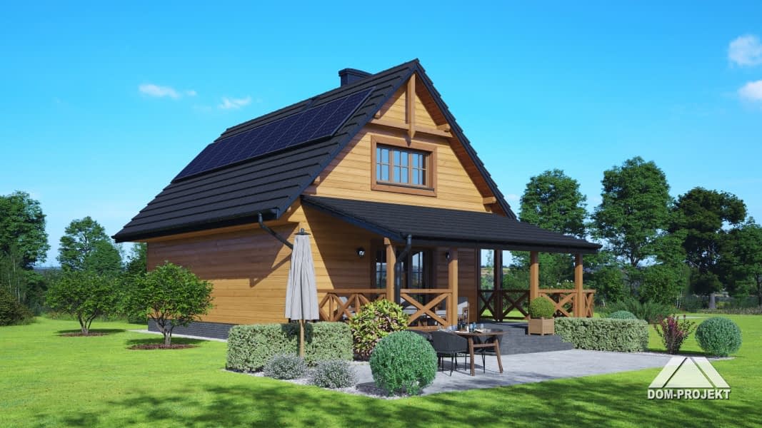Dom w konstrukcji szkieletu drewnianego. Na parterze salon z aneksem kuchennym, kominkiem oraz wyjściem na duży, zadaszony taras. Pokój, łazienka, wiatrołap, schowek. Na poddaszu dwa pokoje, garderoba, łazienka, komunikacja. Zwarta bryła budynku oraz dach dwuspadowy sprzyjają szybkiej i taniej budowie oraz niskim kosztom eksploatacji.Rzuty
