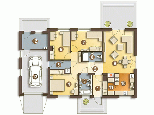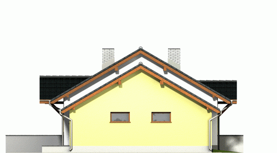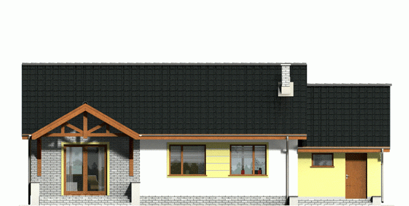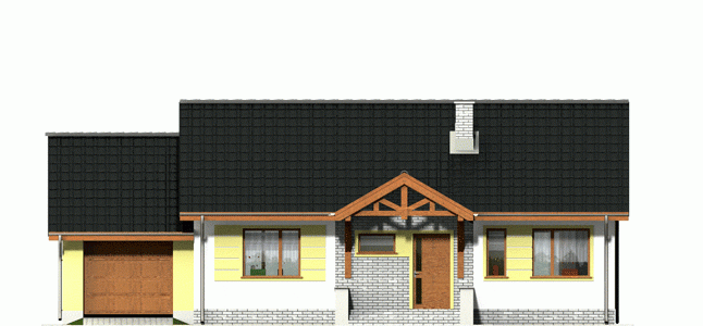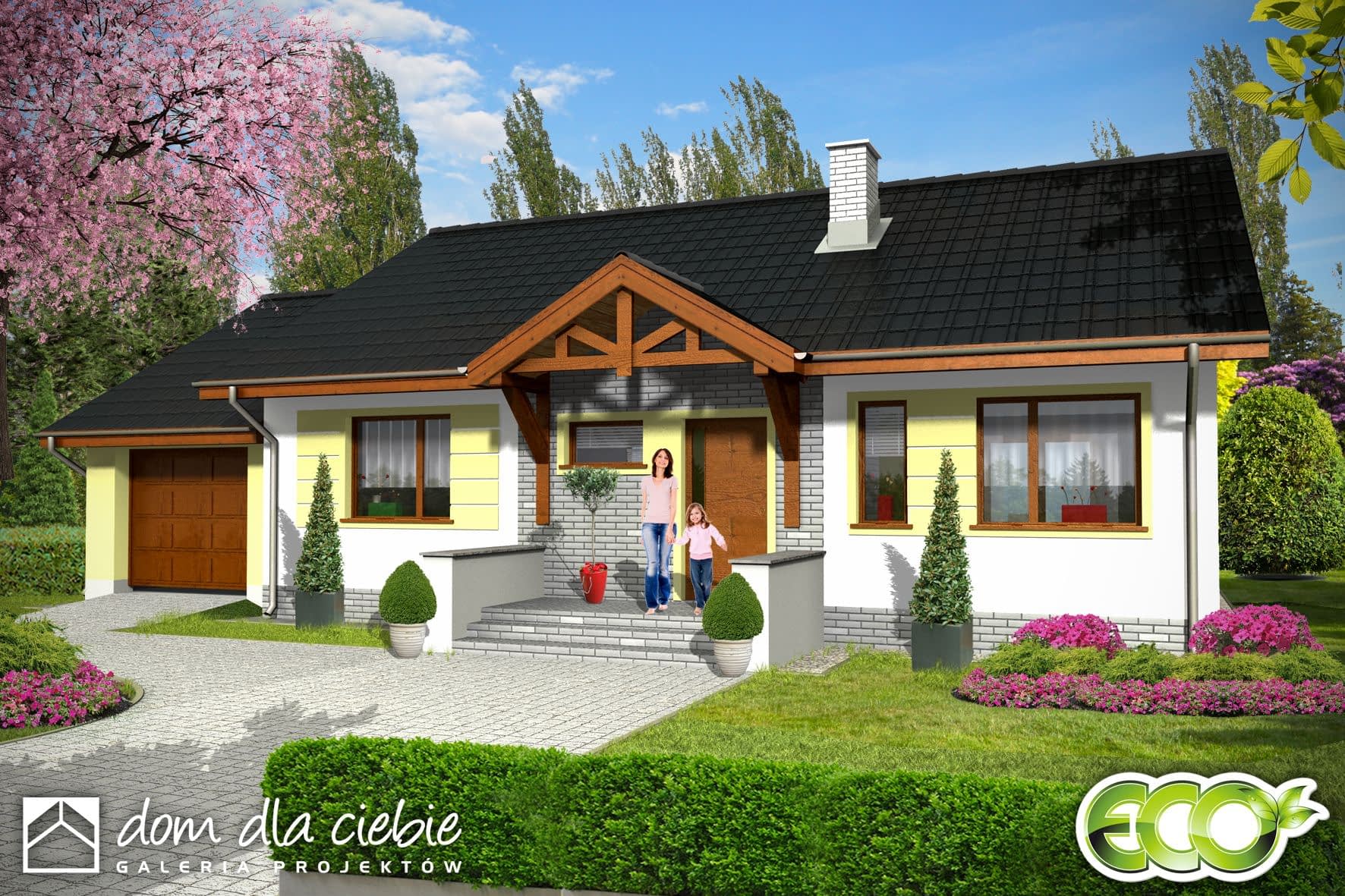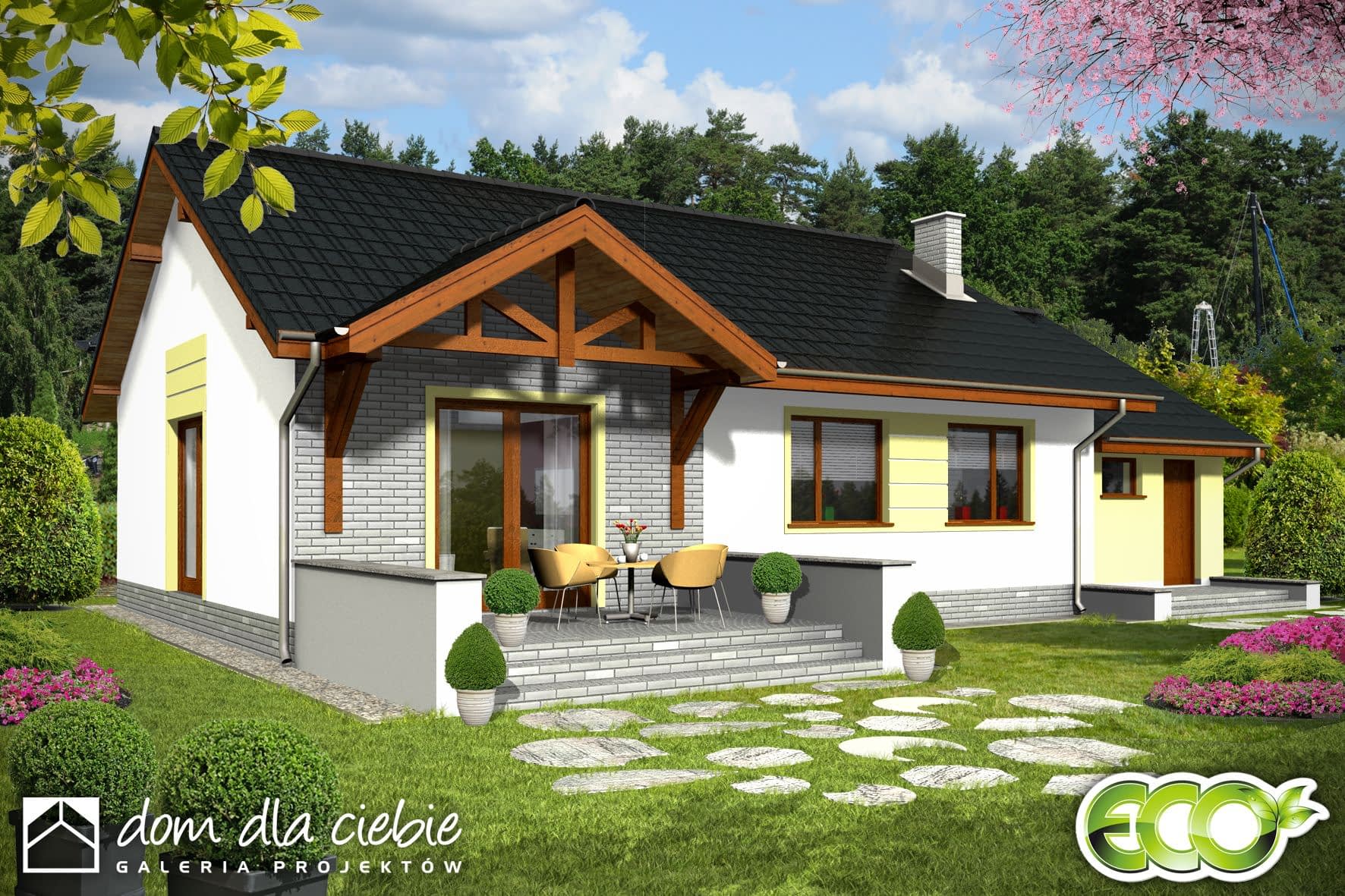 Tradycyjny, nieskomplikowany mały dom parterowy dla 4-osobowej rodziny. Budynek na niewielkiej powierzchni mieści wszystkie potrzebne pomieszczenia: 3 sypialnie, pokój dzienny z wyjściem na zadaszony taras, ustronnie położoną kuchnię ze spiżarnią, dwie łazienki, pralnię oraz duże pomieszczenie z piecem z wejściem zarówno z garażu jak i z ogrodu, które można adaptować na kotłownię na paliwo stałe. Ten mały dom dzięki prostej bryle, dwuspadowym dachu oraz nieskomplikowanym rozwiązaniom konstrukcyjnym daje możliwość niedrogiej realizacji. Dla osób poszukujących podobnego projektu ale na węższe działki oraz z poddaszem przygotowanym do adaptacji polecamy dom Rafi.
