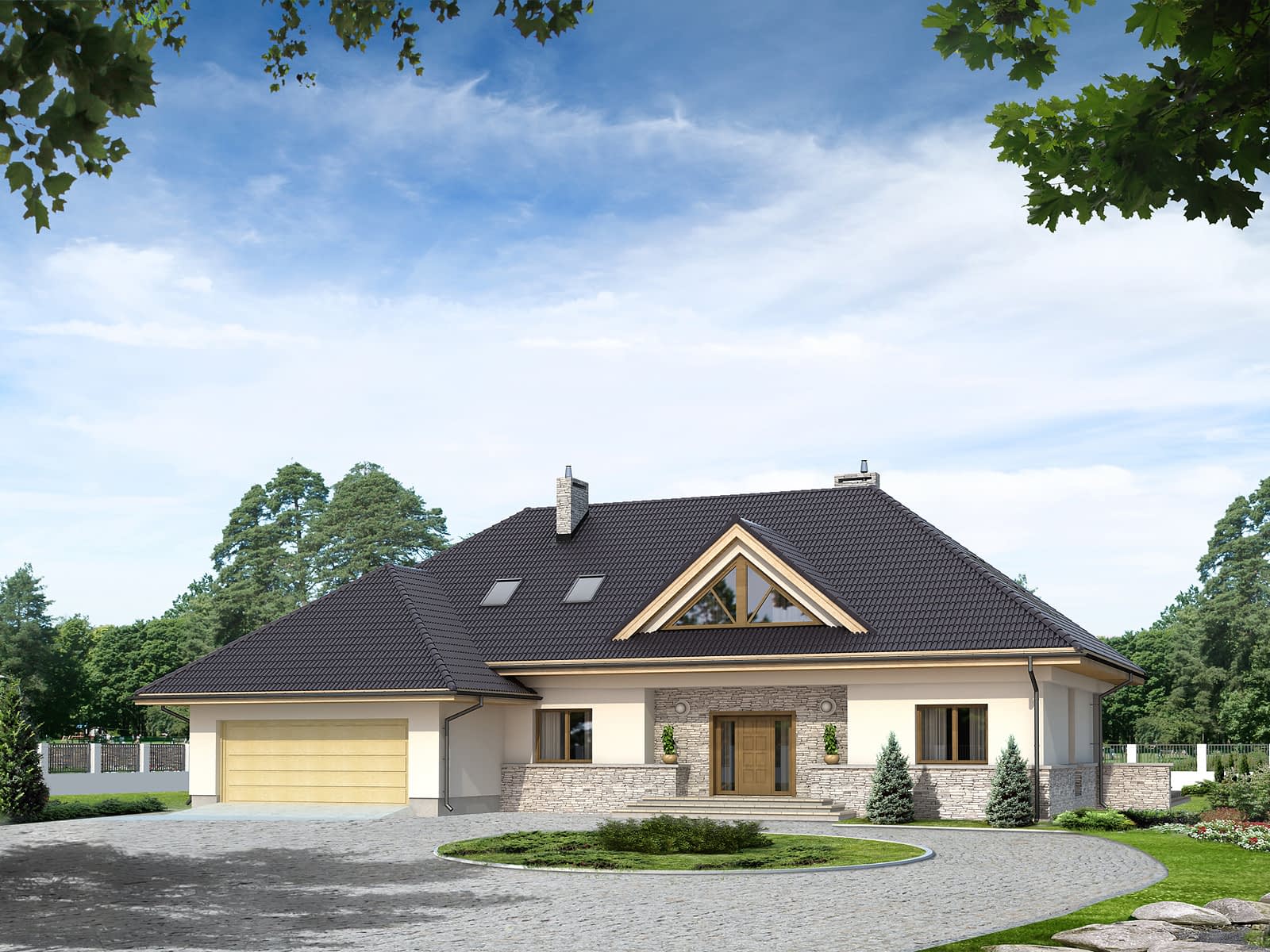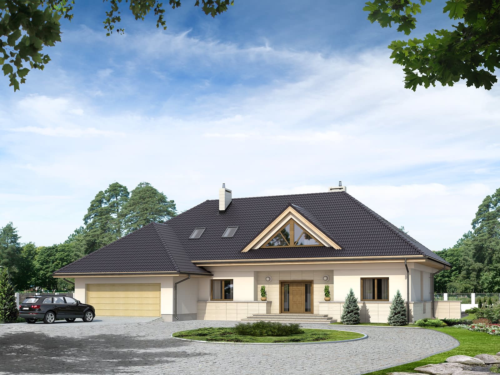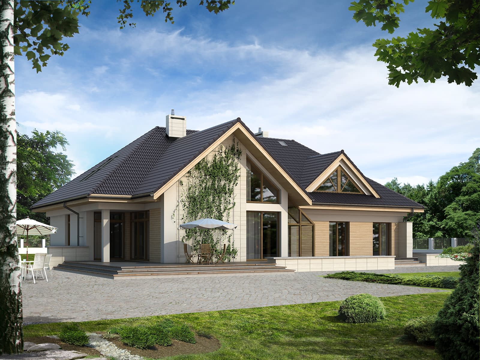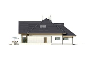 Jednorodzinny dom parterowy z użytkowym poddaszem w stylu rezydencji. Przeznaczony dla 6-osobowej rodziny. Na parterze przewidziano przestronną część dzienną: salon, jadalnię, otwartą kuchnię. Wzbogacono ją o oranżerię i antresolę. Zaprojektowano także dwa dodatkowe pokoje. Na poddaszu przewidziano cztery sypialnie z garderobami oraz dwie łazienki. Mimo zachowania klimatu rezydencji budynek posiada ciekawe, nowoczesne elewacje.Konstrukcja