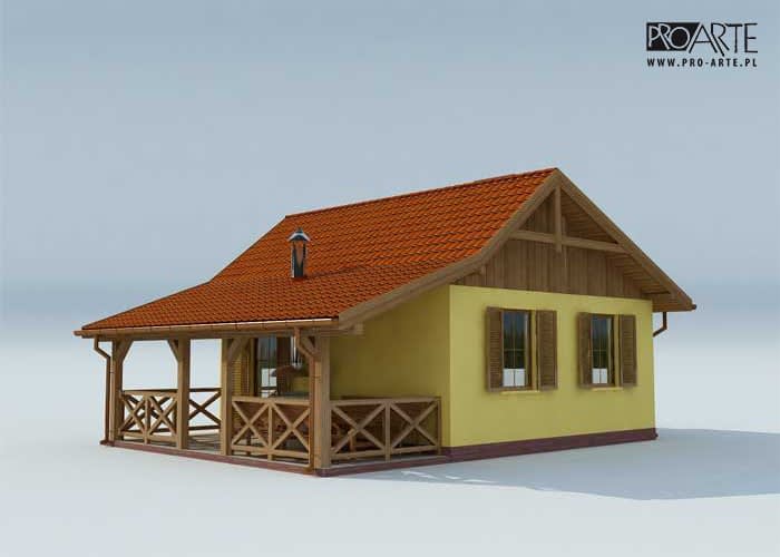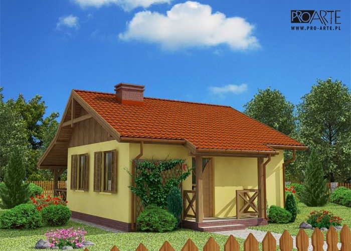 To przepiękny, przyjazny i pełen ciepła domek wypoczynkowy. To miejsce, w którym chciałoby się spędzać wszystkie wolne dni od wiosny aż do jesieni, a nawet dłużej, bo domek wyposażony jest w kominek, dzięki któremu nawet zimne późnojesienne wieczory nie zniechęcą jego bywalców. Ciepły żółty kolor elewacji w połączeniu z czerwienią dachówki i miękkimi brązami drewnianych elementów (okiennice, podbicia dachu i słupki podtrzymujące dach) sprawiają, że domek kusi niepowtarzalnym urokiem. Wakacyjno-weekendową atmosferę tego miejsca podkreśla piękna, stylowa weranda z zewnętrznym kominkiem i miejscem na duży stół, przy którym miło zasiąść w gronie rodzinny czy dobrych przyjaciół. Wnętrze domku także obiecuje udany wypoczynek. Głównym pomieszczeniem jest tu sporych rozmiarów pokój dzienny z kominkiem, aneksem kuchennym, kącikiem wypoczynkowym i wyjściem na werandę. Pozostałe pomieszczenia to sypialnia, łazienka i wiatrołap.