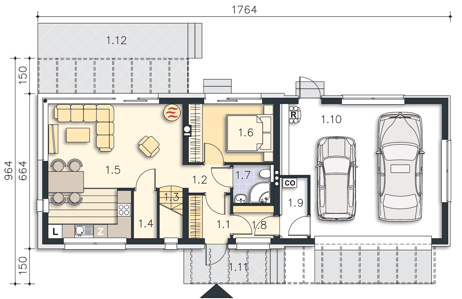 Nowoczesny, energooszczędny dom, idealny dla miłośników prostoty i elegancji. Na parterze zlokalizowany został przeszklony salon z wyjściem do ogrodu i aneksem kuchennym i jedna sypialnia. Jest też łazienka z wc i dwustanowiskowy garaż wkomponowany w bryłę budynku, w którym wydzielono kotłownię. Piętro zajmują trzy sypialnie, garderoba i komfortowa łazienka. Ozdobą domu jest duży taras zlokalizowany na dachu garażu, na który można wyjść z jednej z sypialni. Dom idealnie nadaje się na wąską działkę.