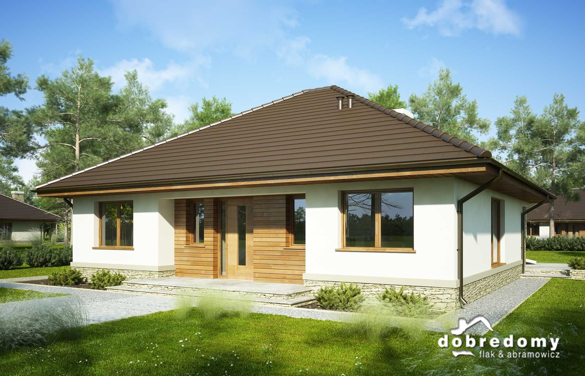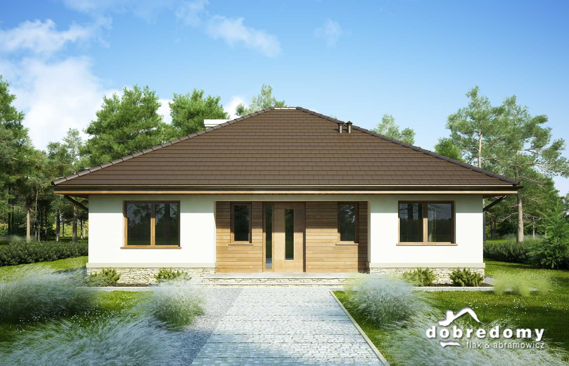 Prosty, mały dom parterowy, bez garażu, dla 4-osobowej rodziny. Strefa dzienna to otwarta przestrzeń: salon połączony z jadalnią i kuchnia. Strefa prywatna to trzy sypialnie i łazienka. Dodatkowe pomieszczenia to: spiżarnia, garderoba, osobna toaleta oraz pomieszczenie gospodarcze. Projekt dostępny jest w wersji z garażem jednostanowiskowym - Benedykt II.