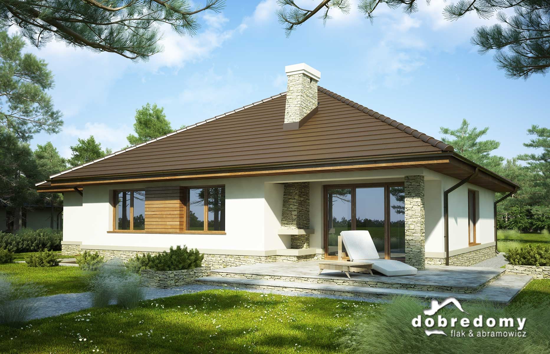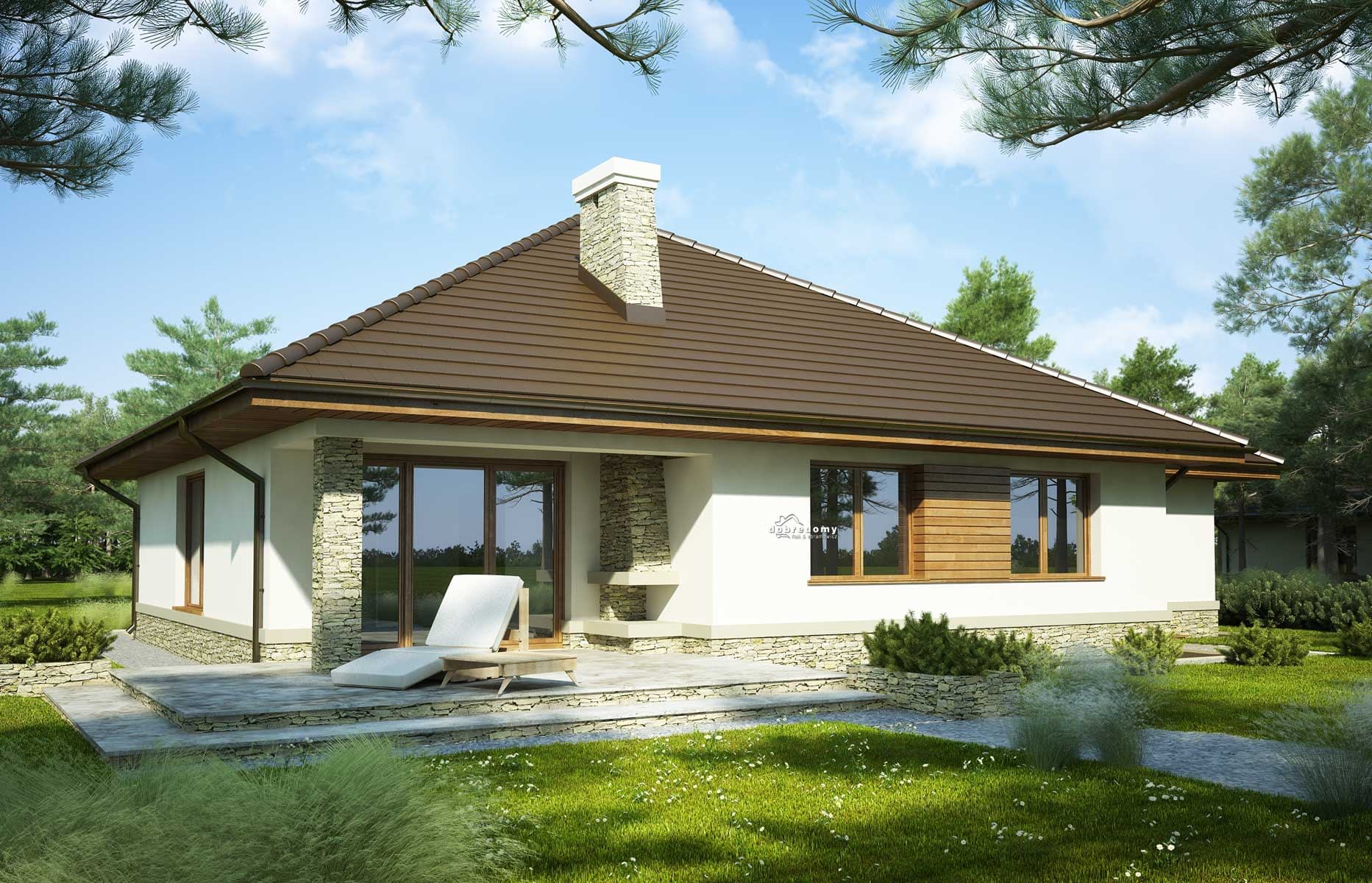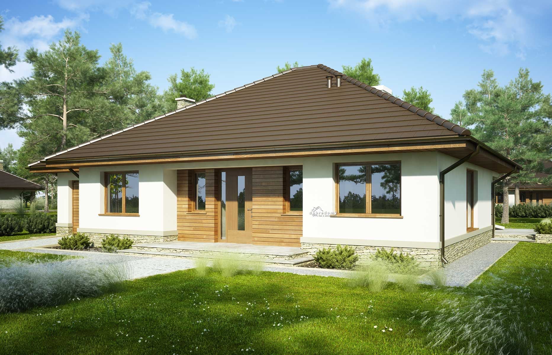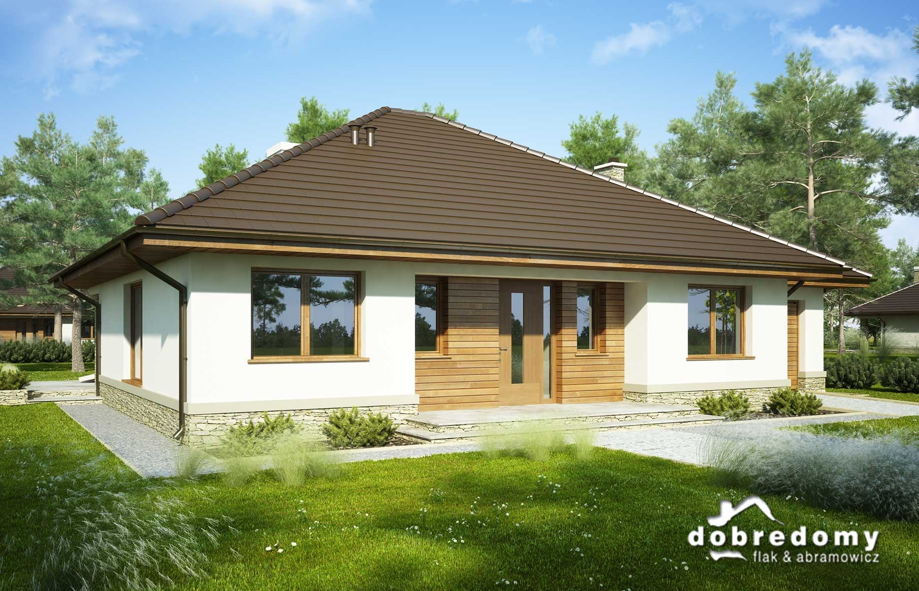 Elewacje pokryte tynkiem strukturalnym w systemie ociepleń Termo Organika oraz okładziną kamienną i drewnianą. Pokrycie dachu - dachówka ceramiczna lub cementowa CREATON.