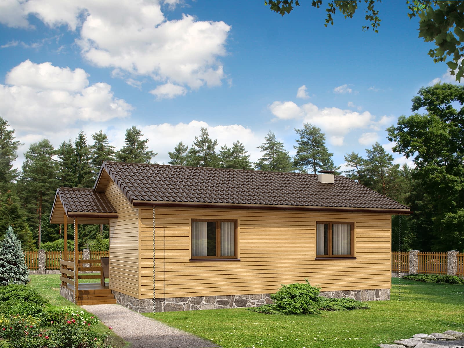 Mały domek letniskowy dla 2 – 4 osób. Parterowy, niepodpiwniczony. Oddzielna sypialnia, pełna łazienka, pomieszczenie dzienne połączone z zadaszonym tarasem.Konstrukcja