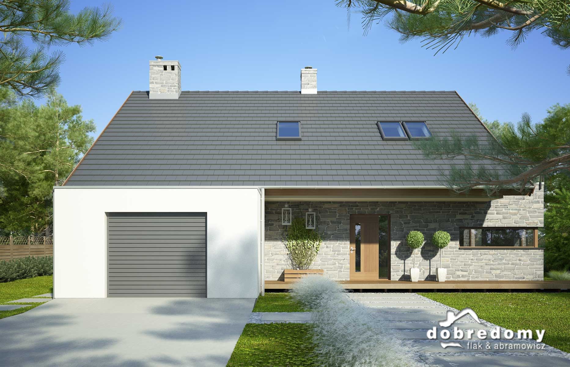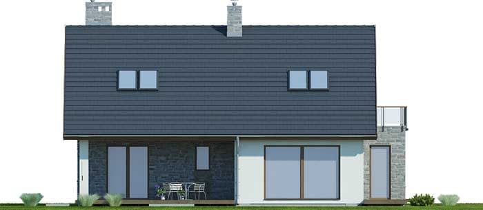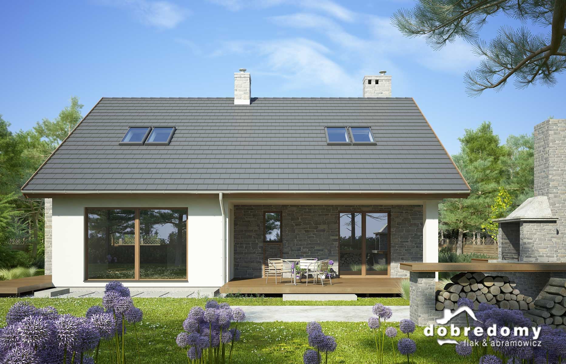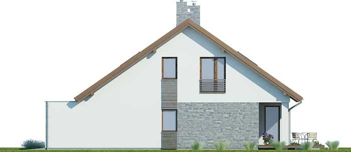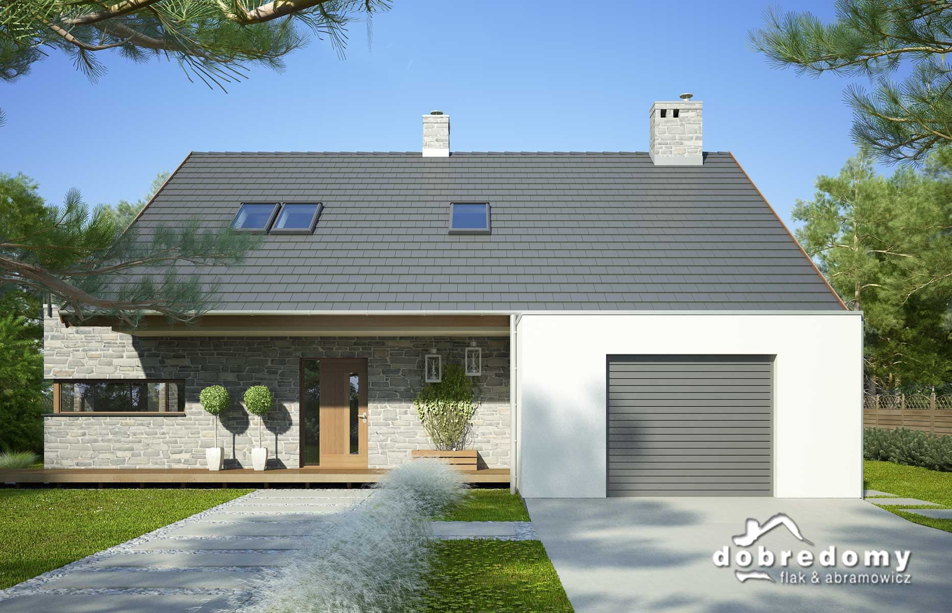 Elewacje pokryte tynkiem strukturalnym w systemie ociepleń Termo Organika i okładziną kamienną. W projekcie zastosowano okna dachowe marki FAKRO. Pokrycie dachu - dachówka ceramiczna lub cementowa CREATON.