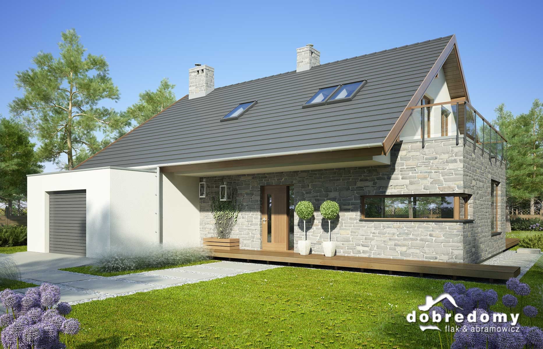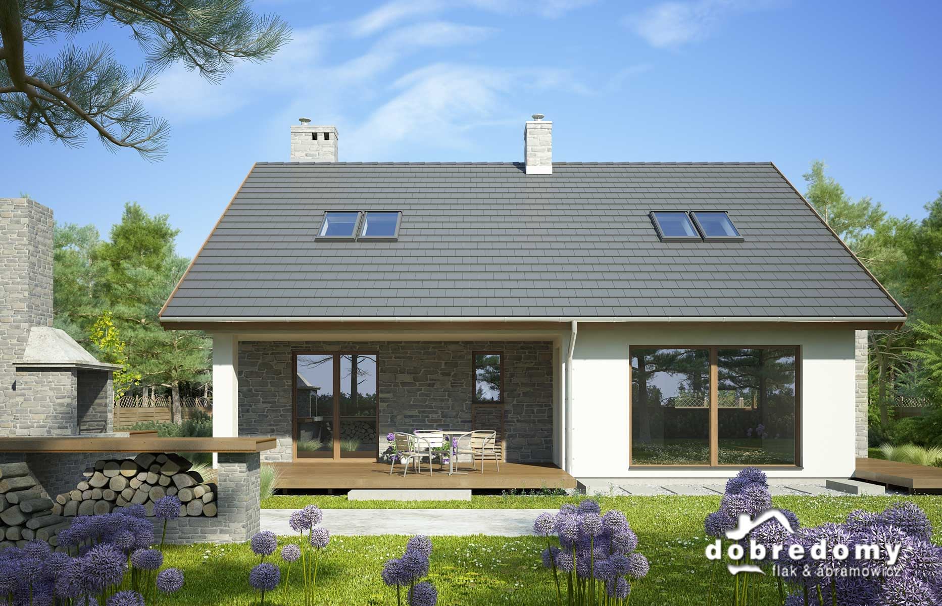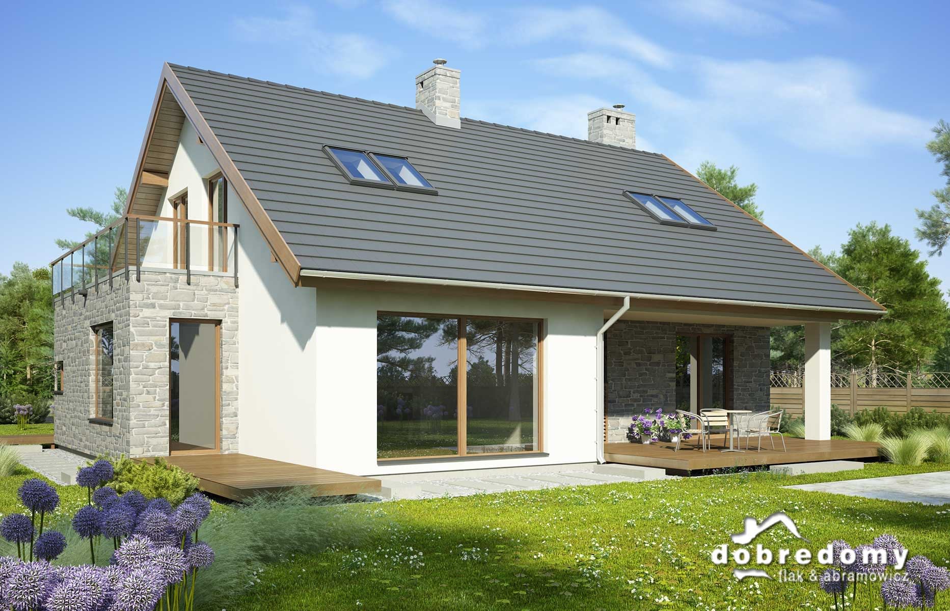 Elewacje pokryte tynkiem strukturalnym w systemie ociepleń Termo Organika i okładziną kamienną. W projekcie zastosowano okna dachowe marki FAKRO. Pokrycie dachu - dachówka ceramiczna lub cementowa CREATON.