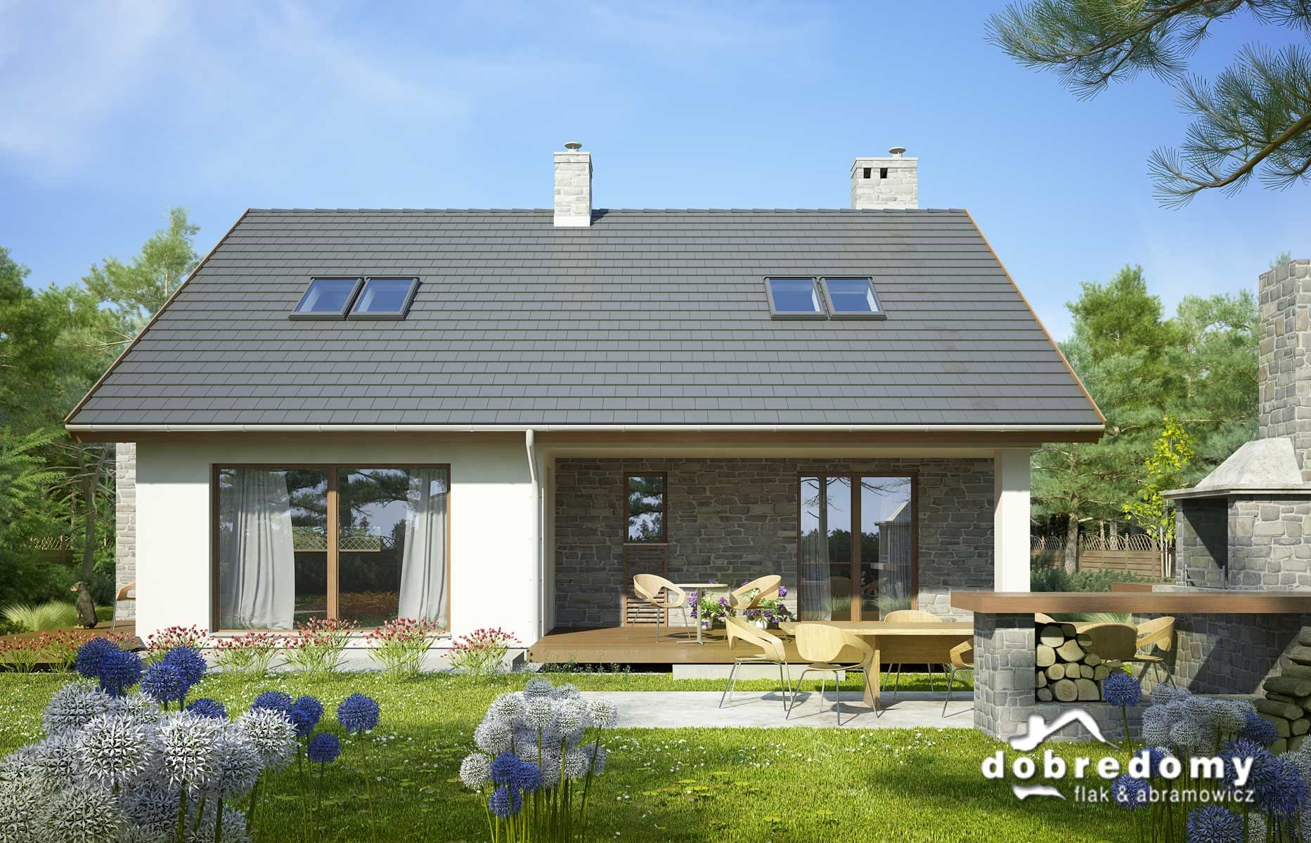 Elewacje pokryte tynkiem strukturalnym w systemie ociepleń Termo Organika i okładziną kamienną. W projekcie zastosowano okna dachowe marki FAKRO. Pokrycie dachu - dachówka ceramiczna lub cementowa CREATON.
