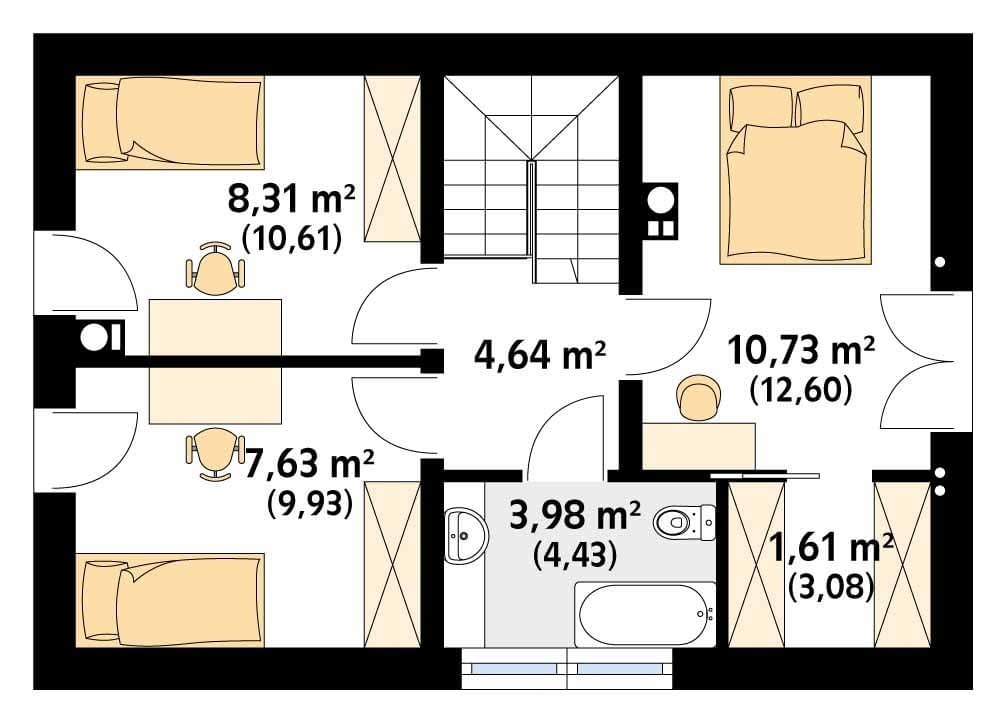 Bez 4 to projekt domu z użytkowym poddaszem o powierzchni 85 m2. Swoim optymalnym programem użytkowym zapewni komfort 4-osobowej rodzinie. Na parterze zaprojektowano otwartą część dzienną, którą tworzą salon i jadalnia. W projekcie przewidziano zamknięta kuchnię, przy której pojawiła się spiżarnia. Układ funkcjonalny parteru dopełnia niewielkie WC oraz kotłownia z niezależnym wyjściem na zewnątrz. Poddasze to cztery wygodne sypialnie oraz rodzinna łazienka.Konstrukcja