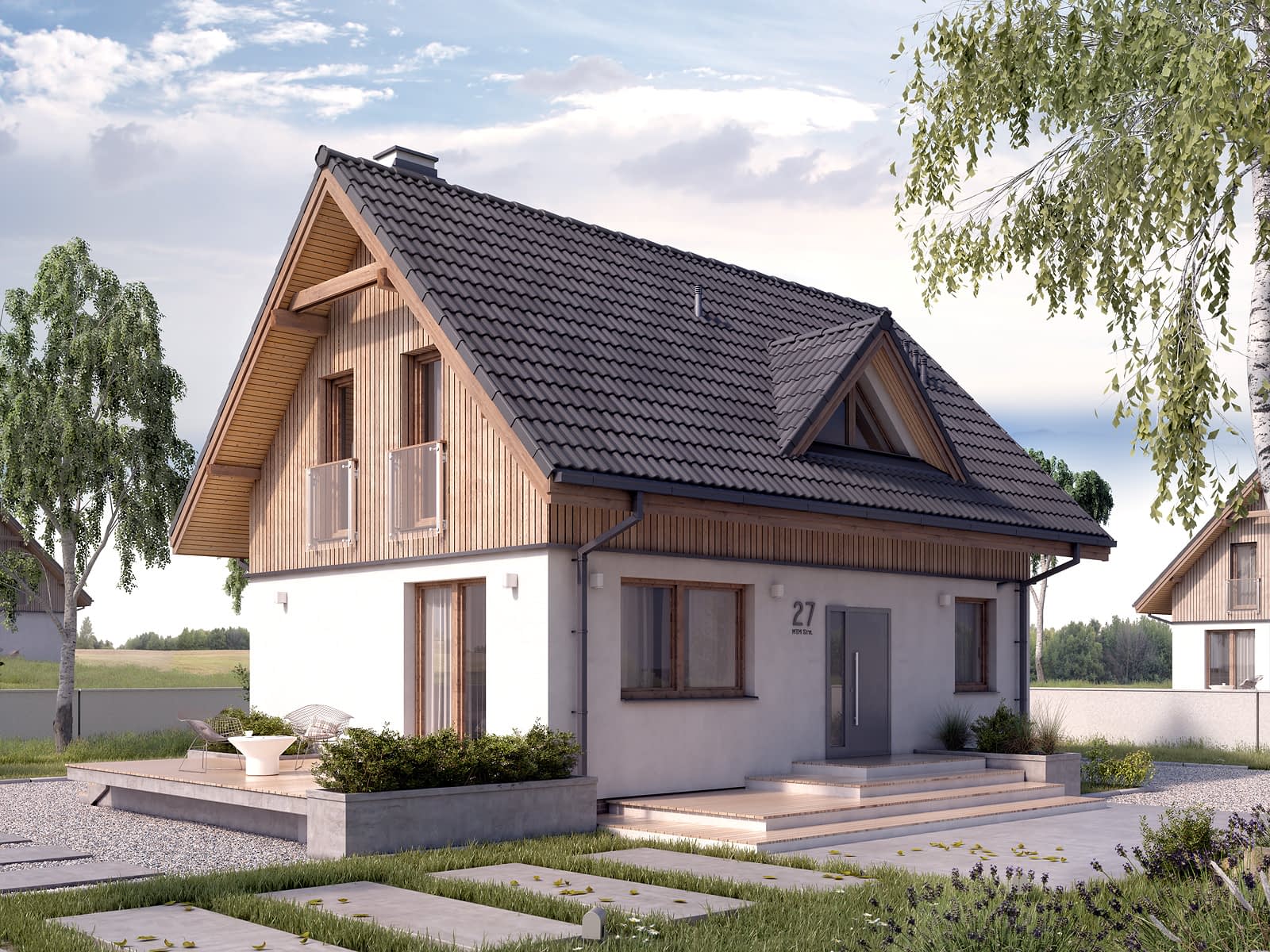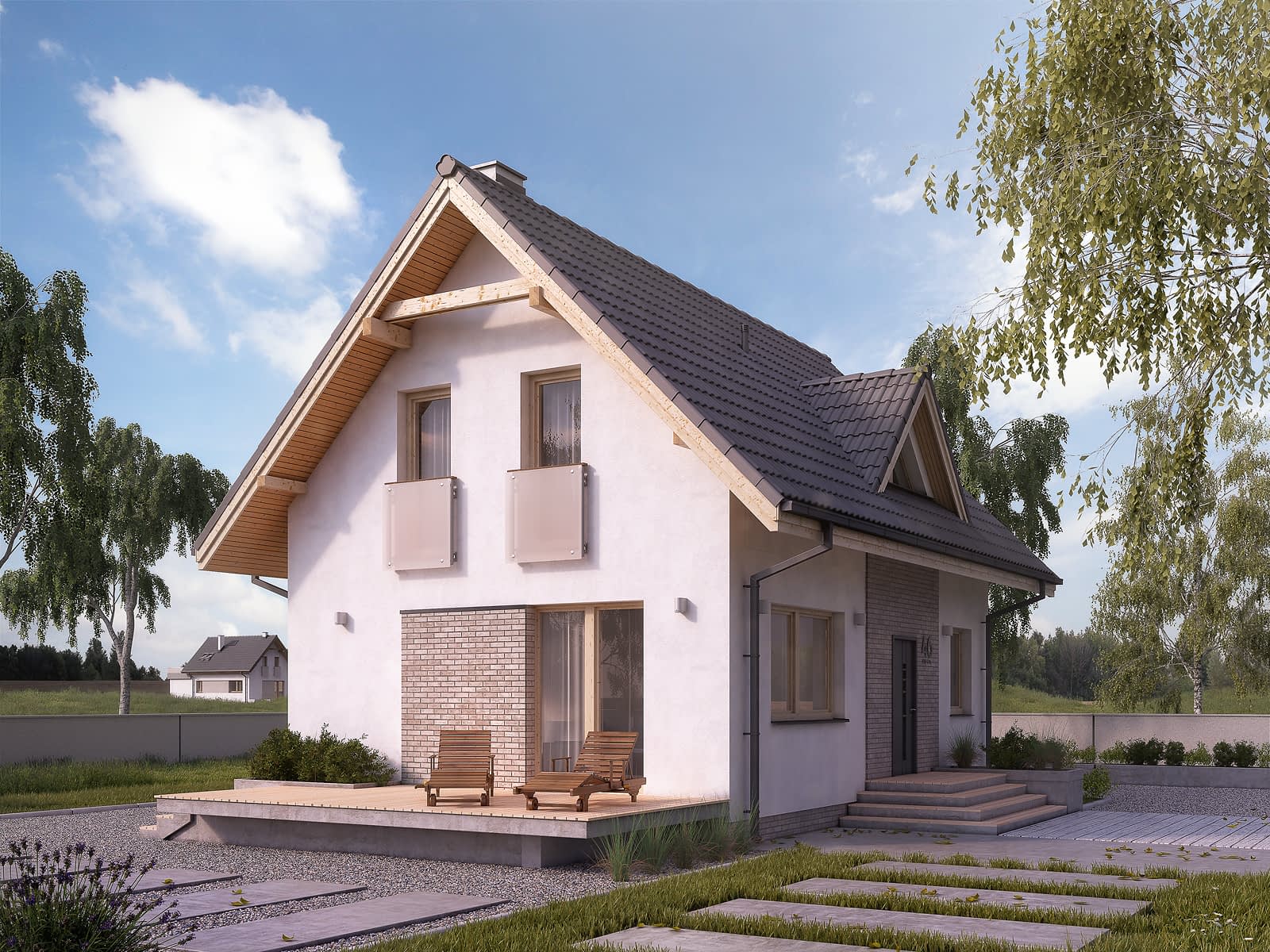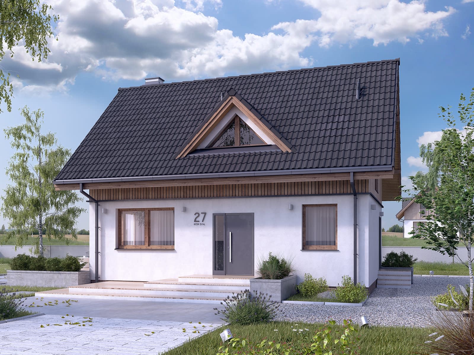 Bez DR-T to projekt popularnego domu z poddaszem, dostosowany do technologii szkieletowej. Optymalne wykorzystanie przestrzeni zapewnia wygodne warunki mieszkaniowe dla 4 osobowej rodziny. Dzięki niewielkim rozmiarom i przyjętym rozwiązaniom projektowym budynek jest ekonomiczny w budowie i użytkowaniu. Na poddaszu znajduje się strefa prywatna, podczas gdy parter przeznaczono na strefę dzienną Walory użytkowe kuchni podnosi spiżarnia.Konstrukcja