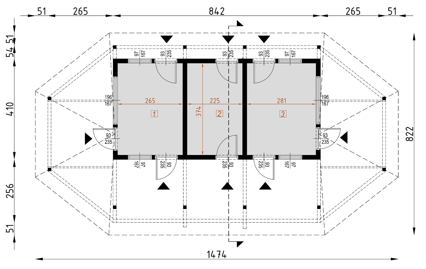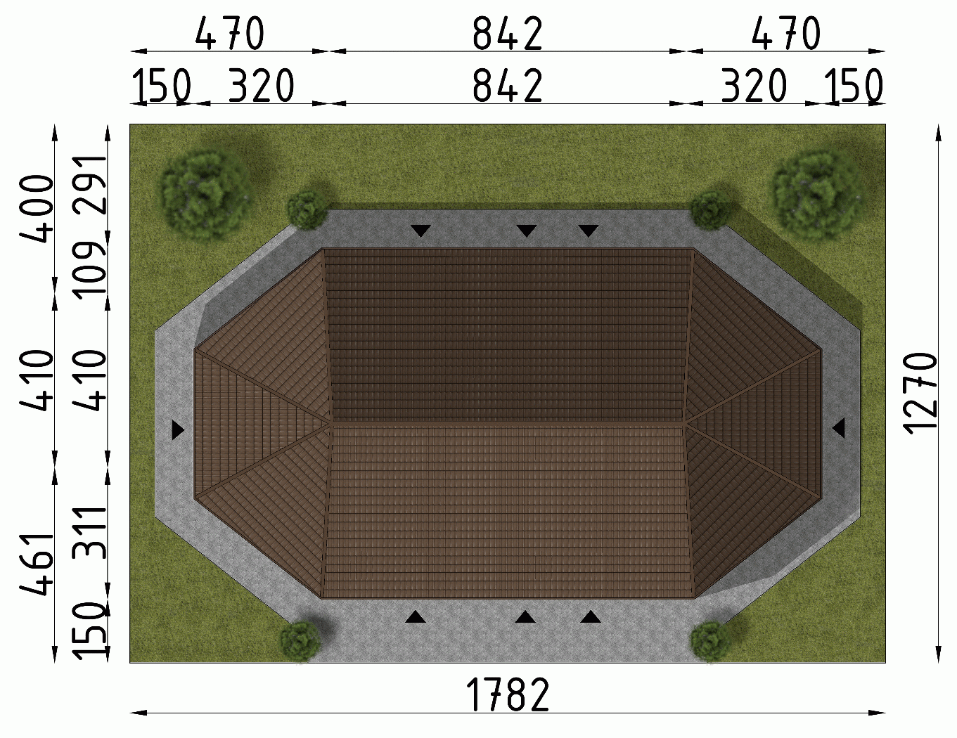 Pawilon, altana ogrodowa o tradycyjnej stylistyce z zapleczem w postaci trzech pomieszczeń gospodarczych np. do przygotowania posiłków, schronienie przed deszczem, składzik na drewno. Idealne miejsce odpoczynku, kulinarnych i towarzyskich spotkań.Konstrukcja