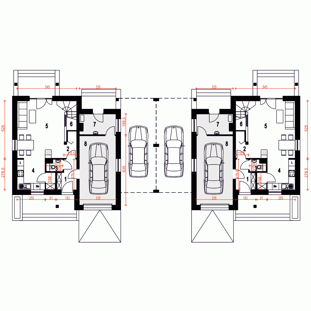 (Uwaga: ten projekt typu bliźniak oferujemy tylko jako dom dwulokalowy).Wariant projektu Biała A1-BL powstał poprzez połączenie dwóch segmentów wiatami.poniższy opis dotyczy jednego segmentu. Projekt gotowy Biała to nieduży dom jednorodzinny z poddaszem użytkowym. Nieduża powierzchnia ( ok. 95 m2 - bez garażu) została wykorzystana efektywnie zyskując ustawną przestrzeń. Parter zawiera strefę wspólną, dzienną, gdzie mieści się prostokątny, ustawny salon z jadalnią i wyjściem na zadaszony taras oraz otwartą kuchnię a także schody na druga kondygnację. W centralnym punkcie salonu zaprojektowano komin, do którego można podłączyć kominek równomiernie rozprowadzający ciepło po domu. Miejsce na niewielką garderobę dostępną z holu zostało przewidziane pod schodami. Kuchnia wyposażona została w wygodną spiżarnię, a z wiatrołapu można dostać się do WC i garażu oraz dalej do kotłowni przewidzianej na paliwo gazowe. Na piętrze zaprojektowano trzy sypialnie, oraz duża łazienkę.Biała, to zgrabny domek z zadaszonym wejściem, praktycznym podcieniem za kotłownią oraz zadaszonym wyjściem na taras. W pokojach na piętrze przewidziano portfenetry i dodatkowo okna połaciowe co spowoduje ich doskonałe doświetlenie. Projekt ten szczególnie polecamy na wszystkie tereny zarówno podmiejskie, miejskie i wiejskie ze względu na jej uniwersalną architekturę. Oszczędna forma i optymalnie wykorzystana powierzchnia użytkowa sprawia że domek ten bedzie tani i ekonomiczny w eksploatacji oraz budowie.