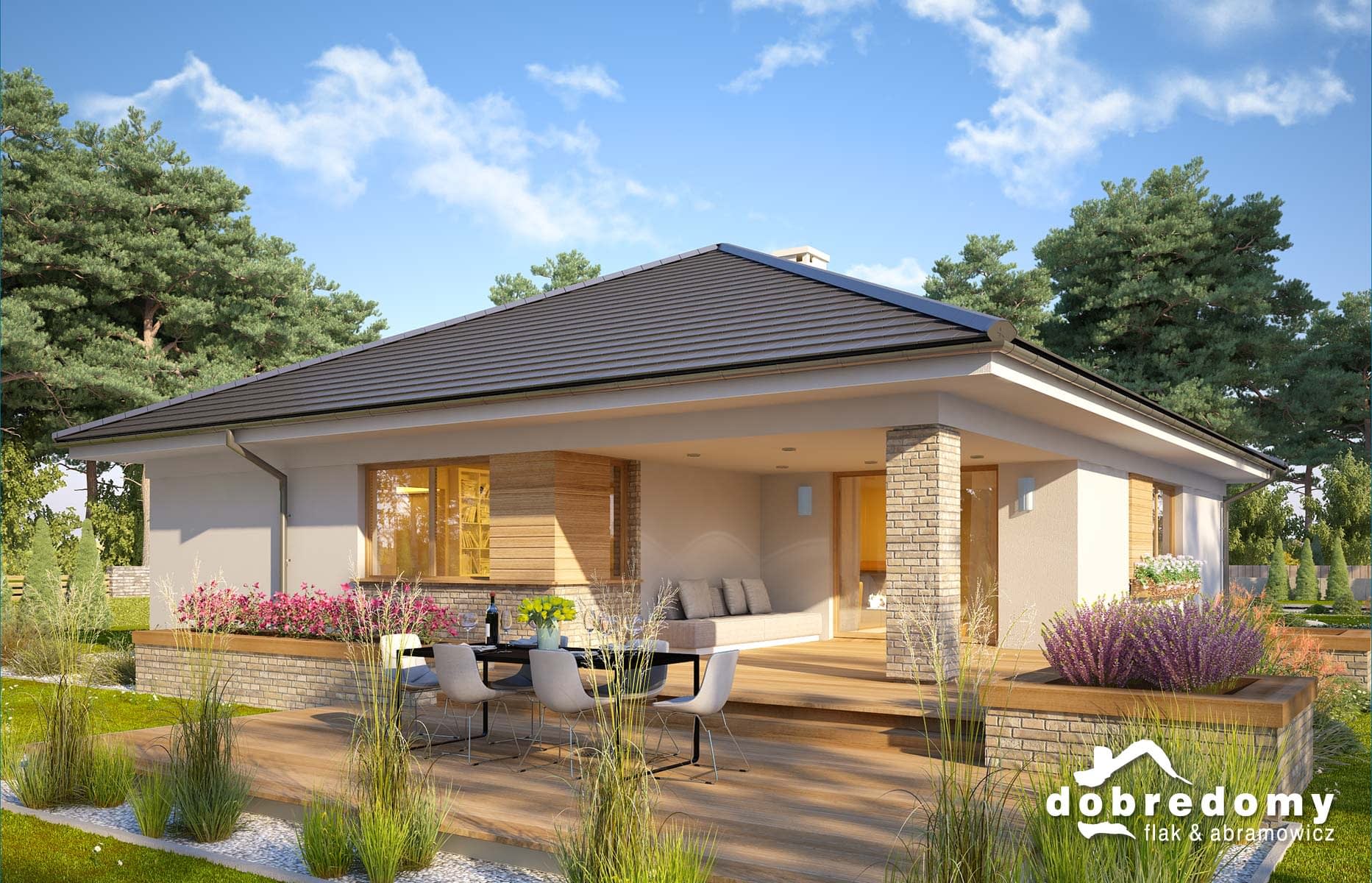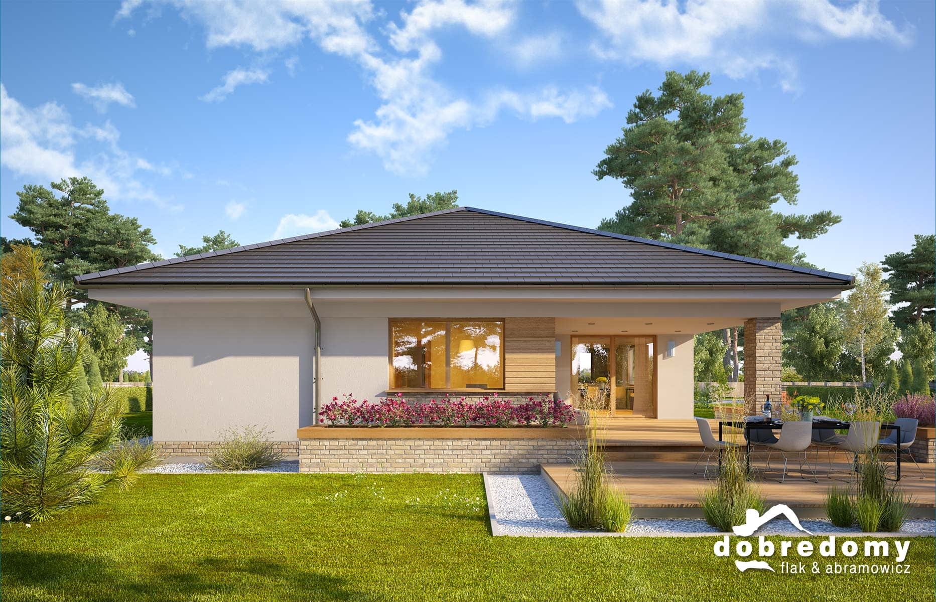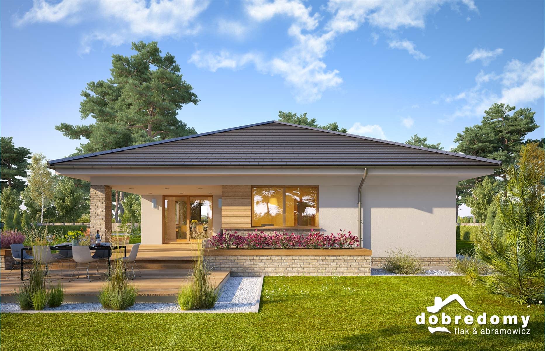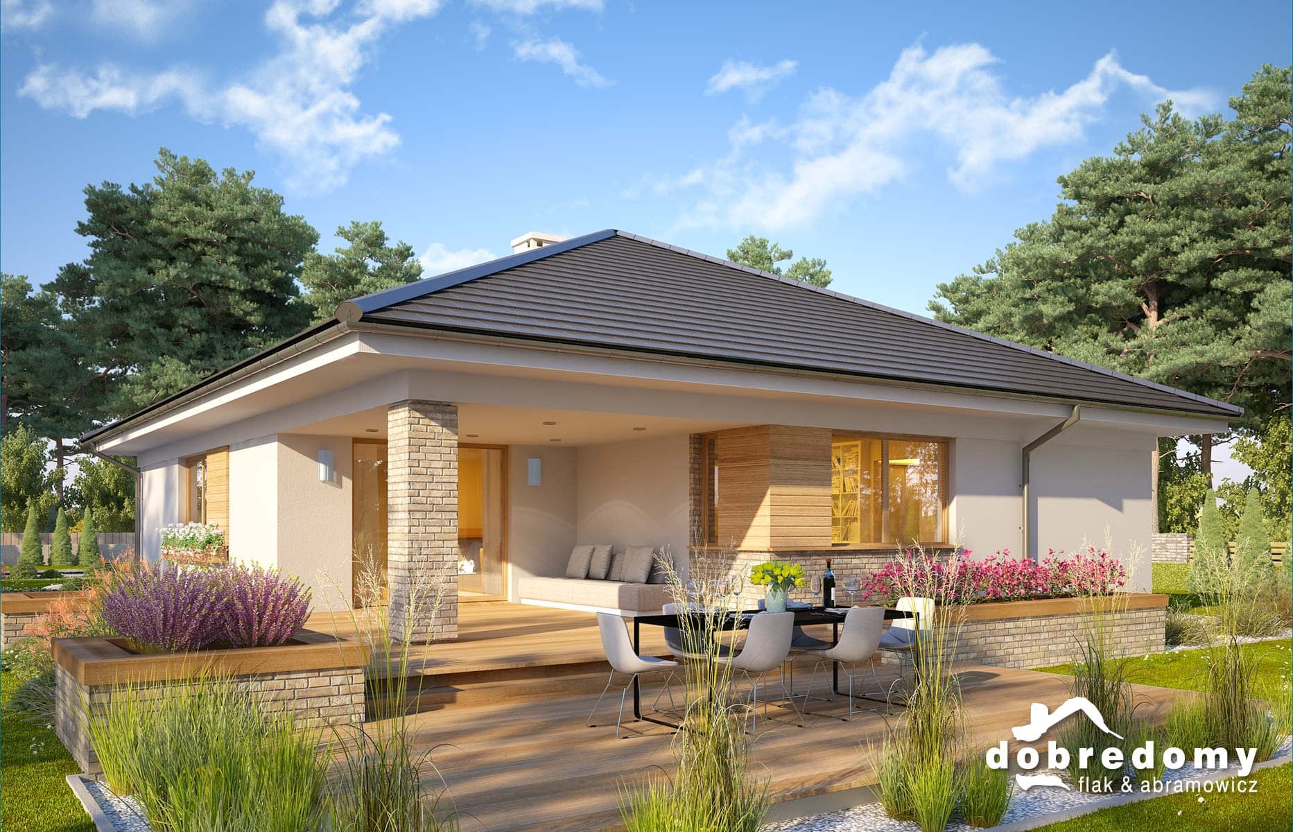 Dom parterowy, niepodpiwniczony, przeznaczony dla 4-5 osobowej rodziny. W części dziennej zlokalizowano otwartą kuchnię połączoną z pokojem dziennym poprzez jadalnię. Sypialnie z ogólnodostępną łazienką i garderobą zaprojektowano w odizolowanej części nocnej. Dodatkowo sypialnia rodziców posiada własną garderobę i łazienkę.