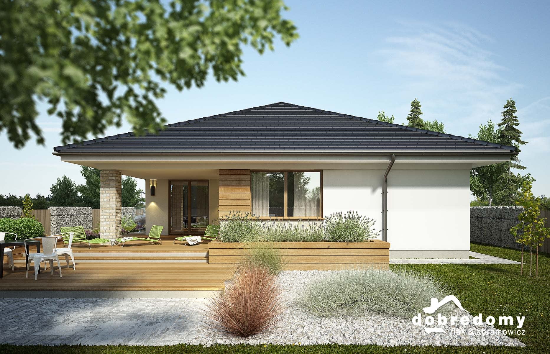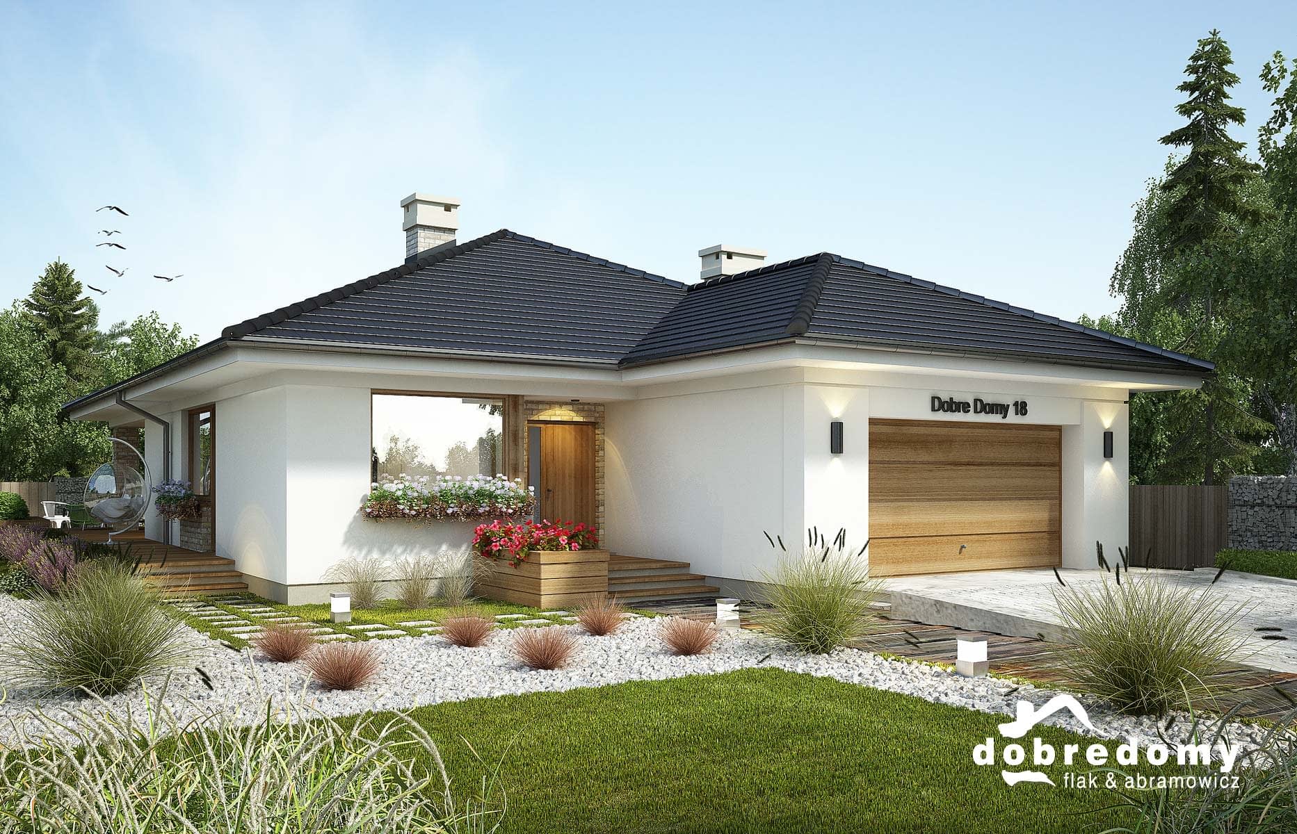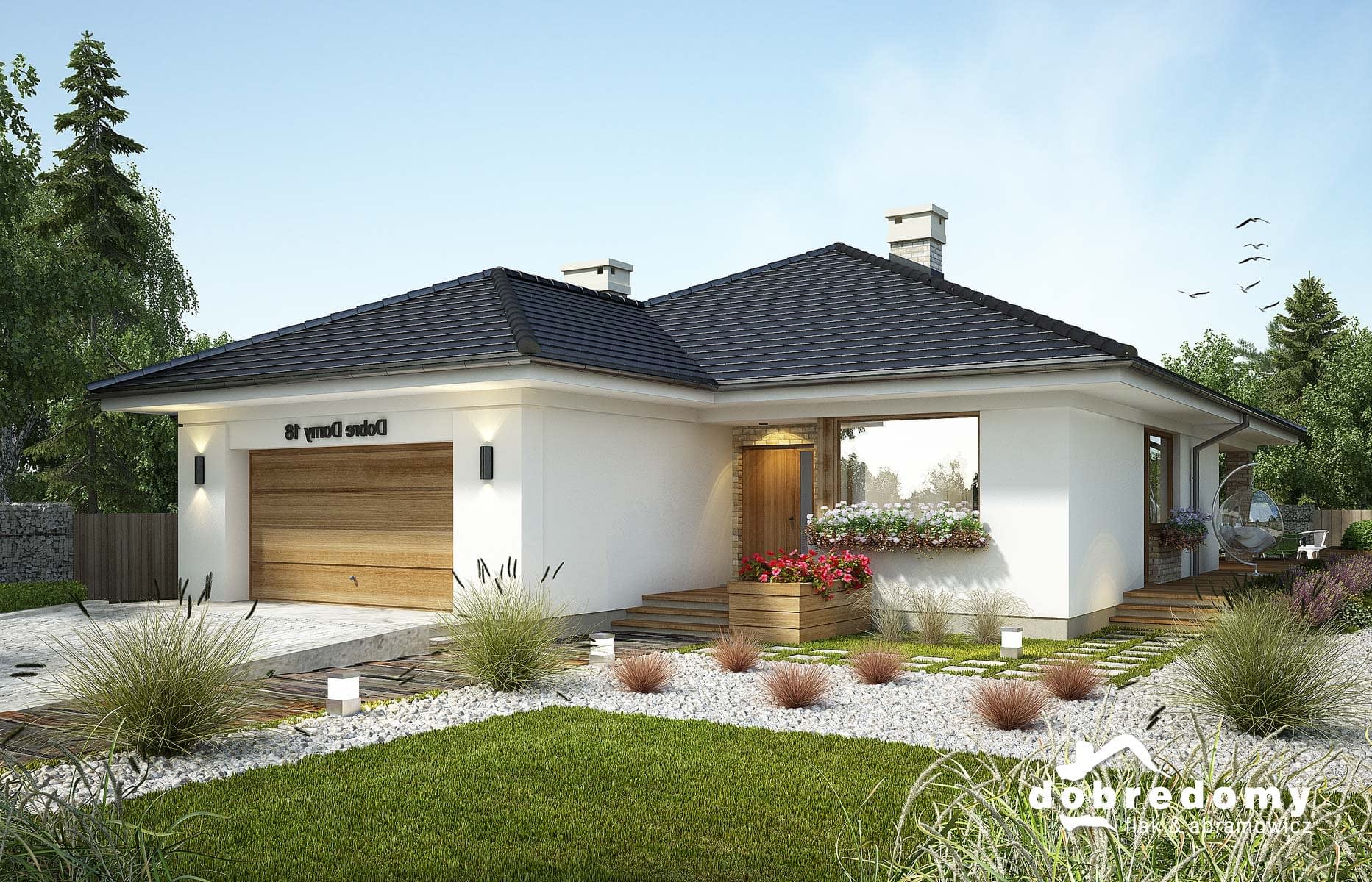 Dom parterowy, niepodpiwniczony, przeznaczony dla 4-5 osobowej rodziny. W części dziennej zlokalizowano otwartą kuchnię połączoną z pokojem dziennym poprzez jadalnię. Sypialnie z ogólnodostępną łazienką i garderobą zaprojektowano w odizolowanej części nocnej. Dodatkowo sypialnia rodziców posiada własną garderobę i łazienkę.
