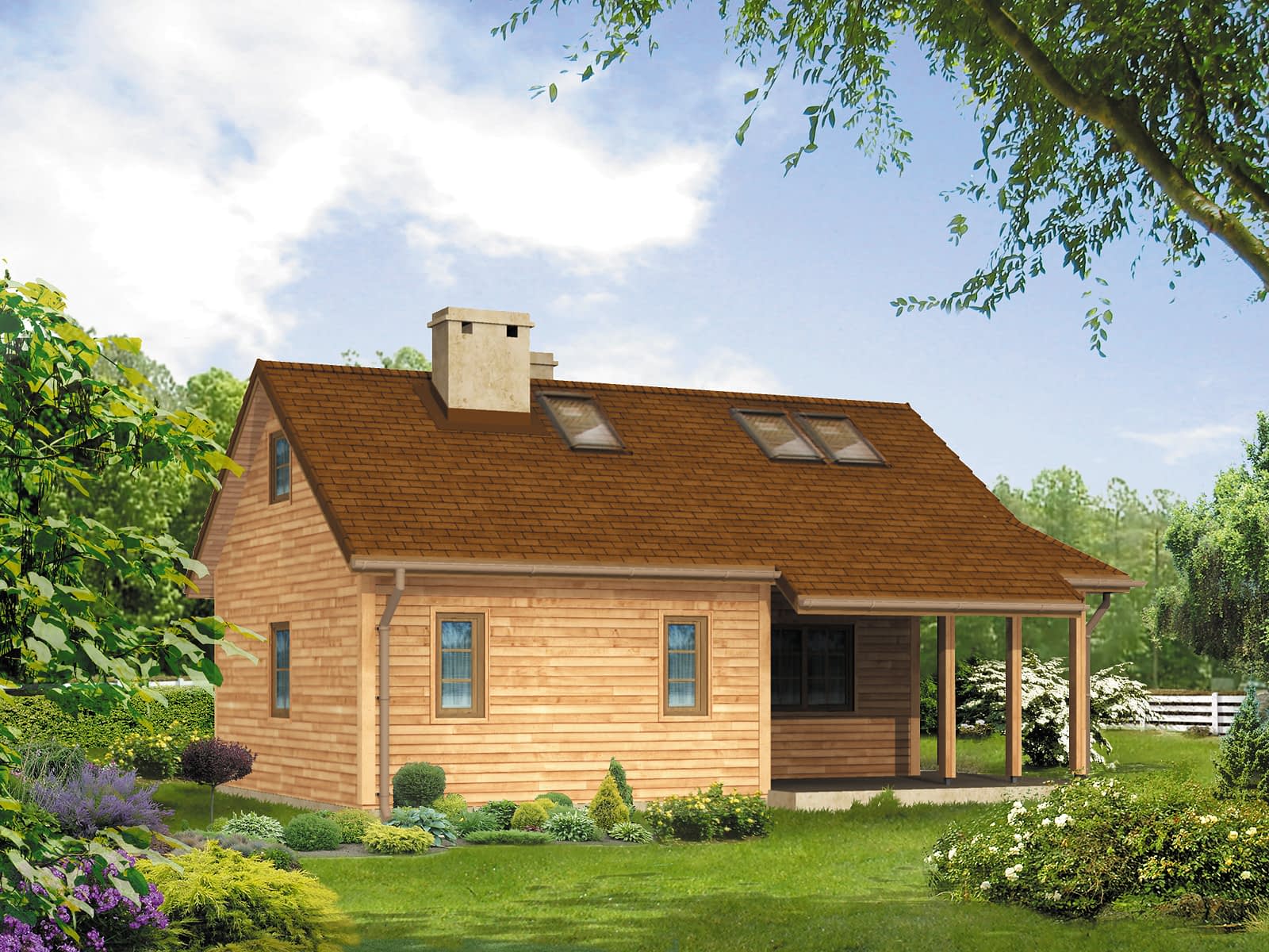 Dom rekreacyjny z możliwością zamieszkiwania o każdej porze roku. Na dole zaprojektowano sporą kotłownię, pokój dzienny z kominkiem i aneksem kuchennym oraz łazienkę. Na poddaszu znajduje się strych, kóry można wykorzystać jako część sypialną domu dzięki wygodnym schodom biegnącym na poddasze z pokoju dziennego.Konstrukcja