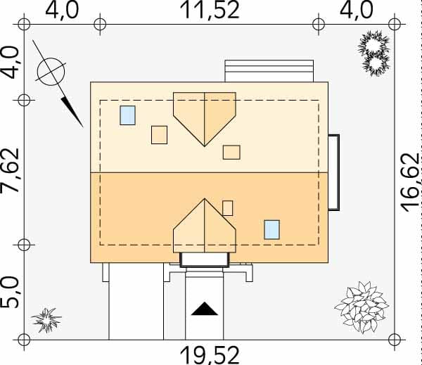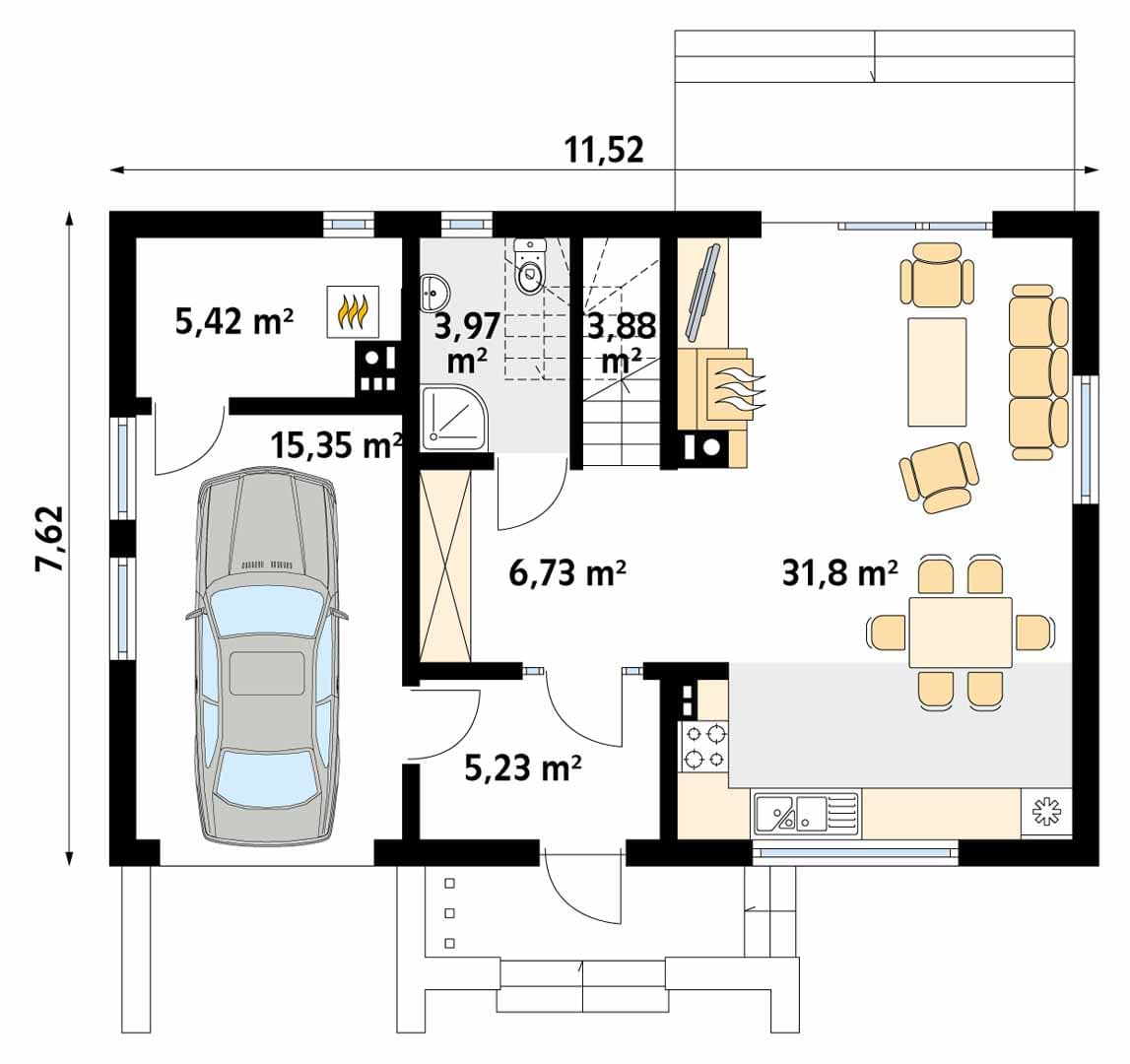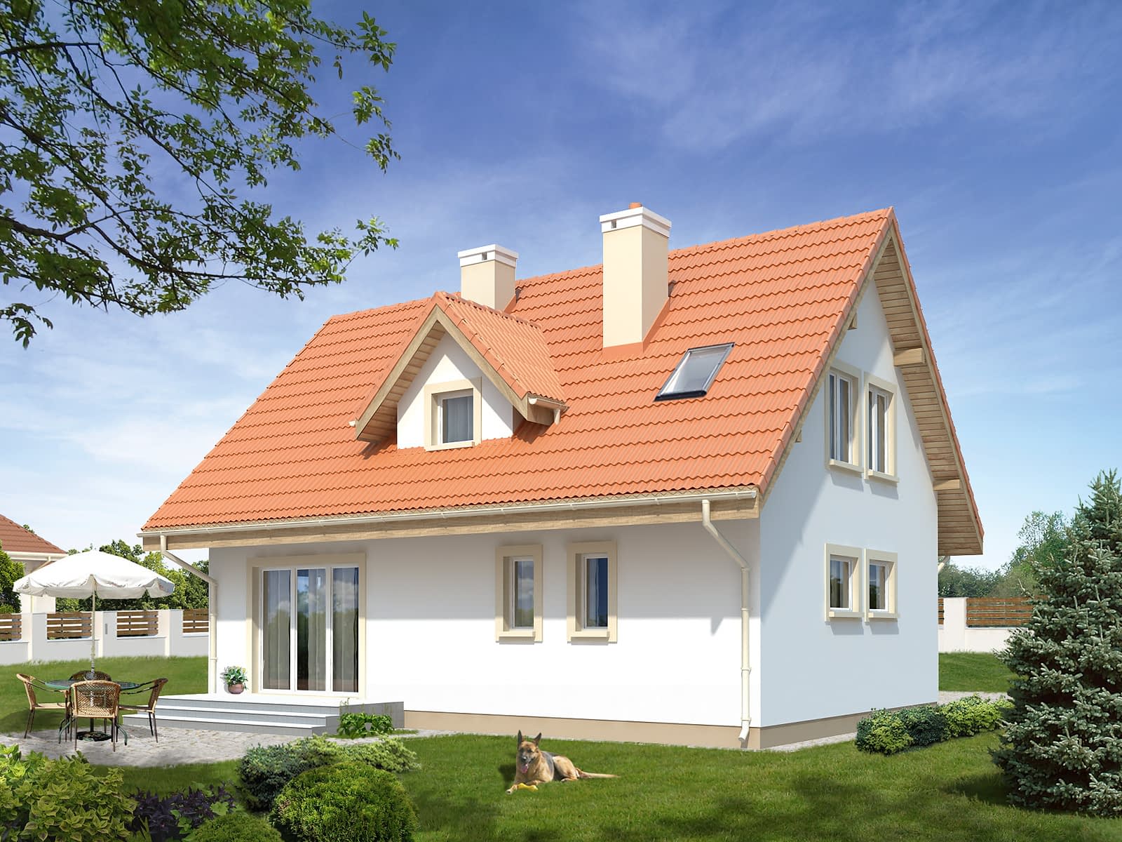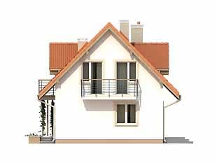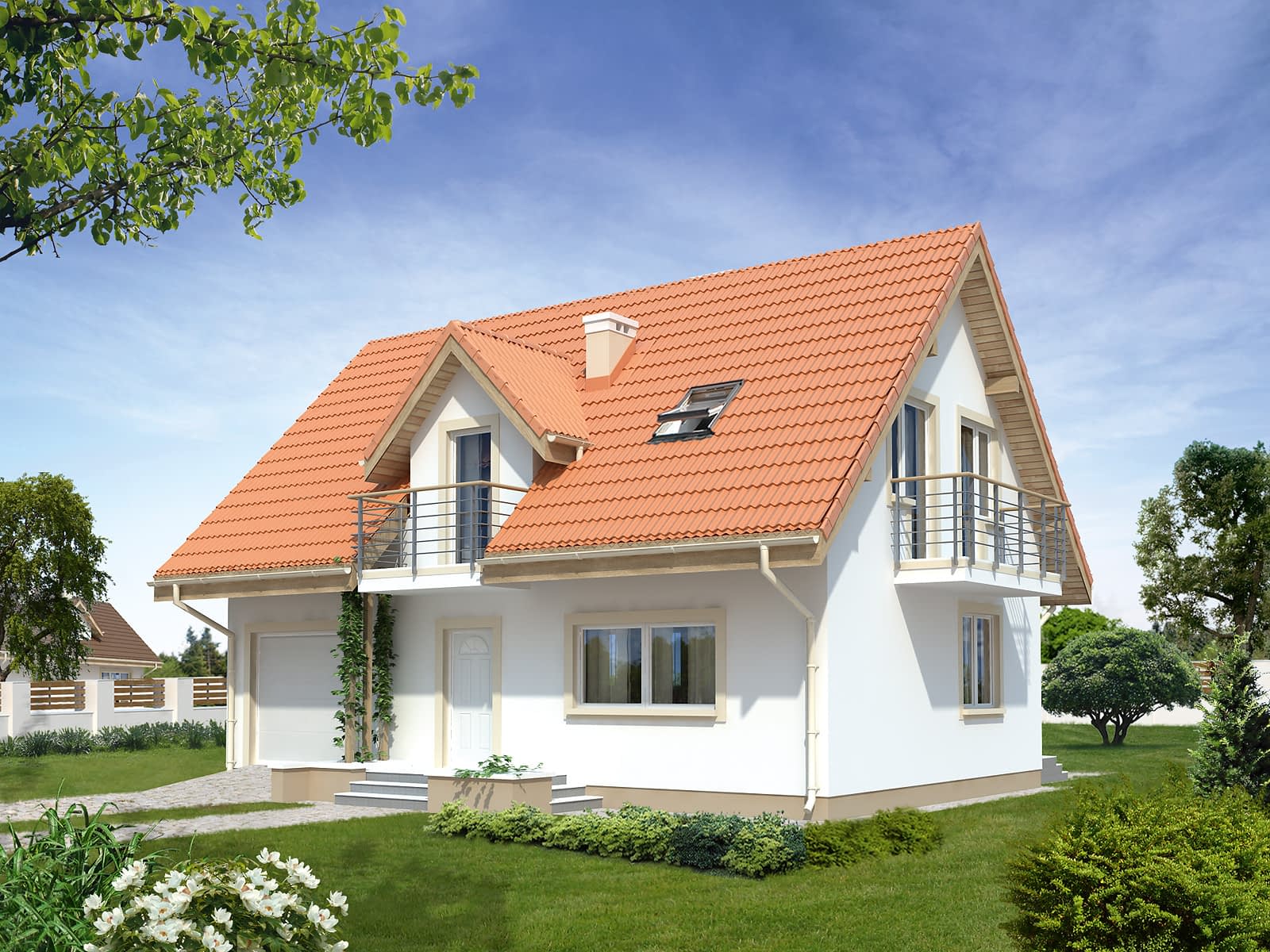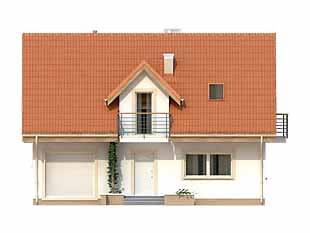 Mały dom jednorodzinny z użytkowym poddaszem i garażem w bryle budynku. Idealny dla niewielkiej rodziny. Na parterze znajduje się przestronna część dzienna i pomieszczenia gospodarcze, na poddaszu trzy wygodne sypialnie z balkonami i duża łazienka z pralnią.Konstrukcja
