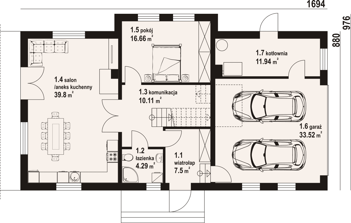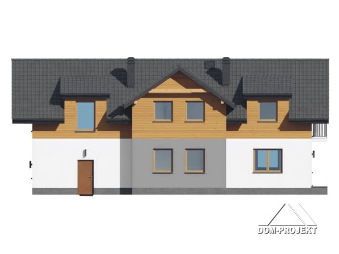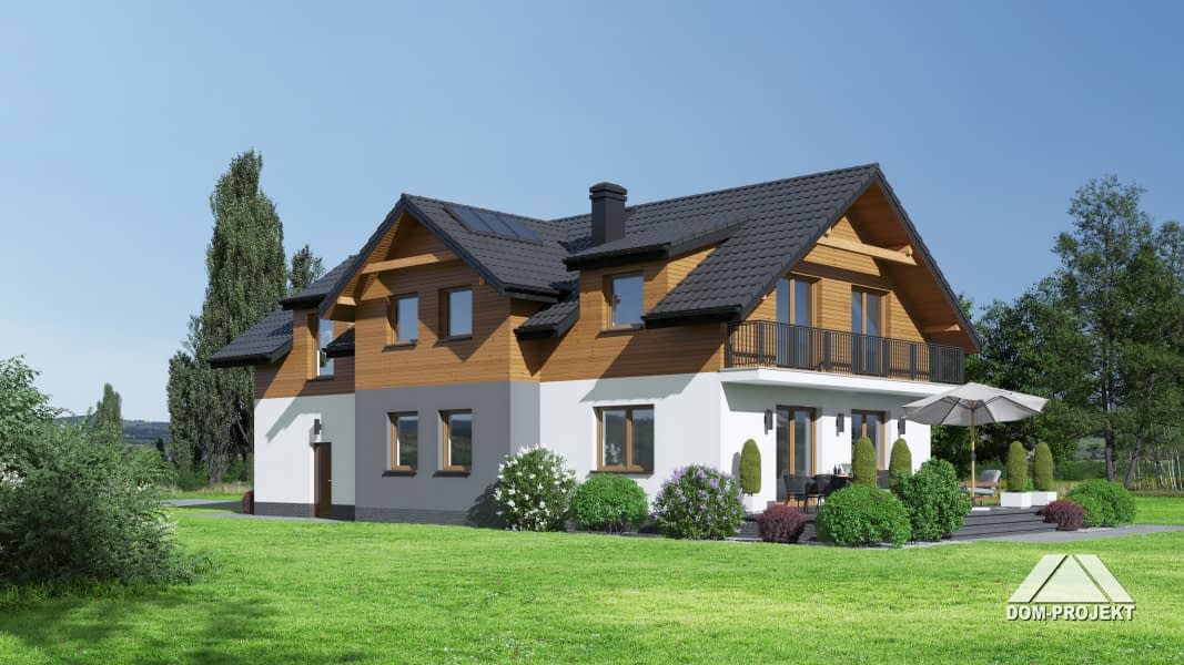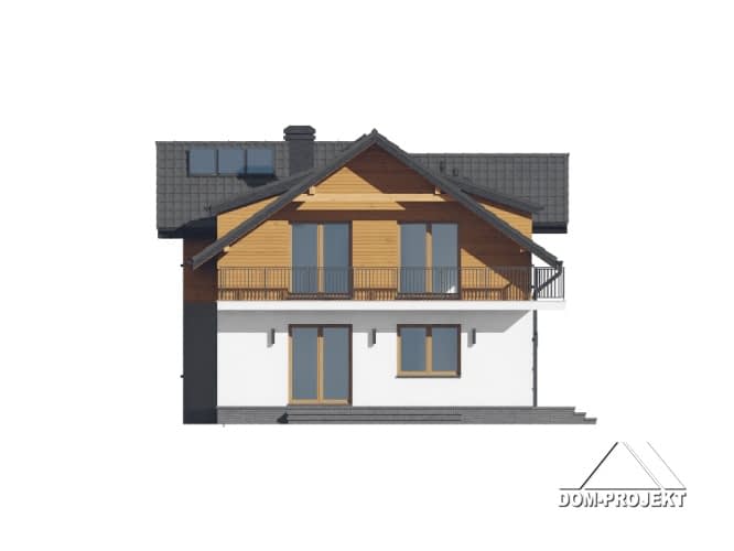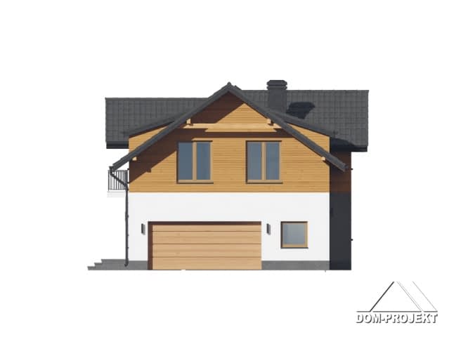 Dom z poddaszem użytkowym. Na parterze duży salon z aneksem kuchennym, kominkiem oraz wyjściem na taras. Pokój, komunikacja, łazienka, wiatrołap, kotłownia oraz garaż na dwa samochody. Na poddaszu cztery pokoje, garderoba, łazienka i komunikacja. Zwarta bryła budynku oraz dach dwuspadowy sprzyjają szybkiej i taniej budowie oraz niskim kosztom eksploatacji.Rzuty