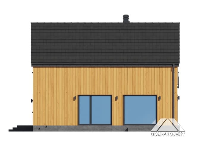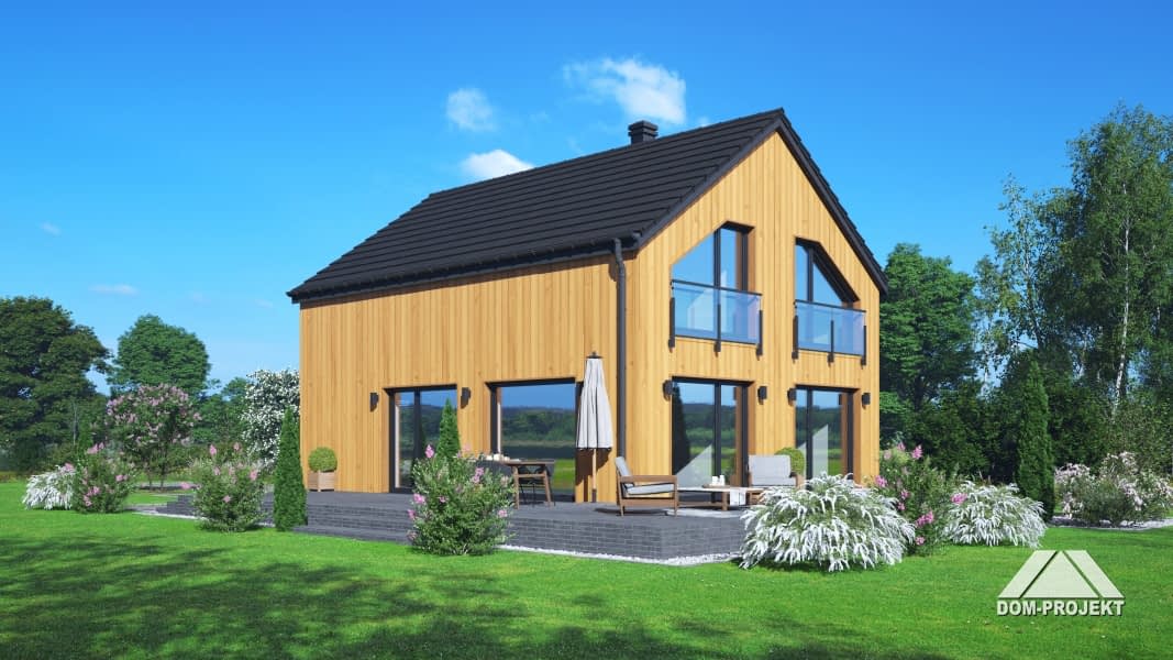 Dom w konstrukcji szkieletu drewnianego. Na parterze salon z aneksem kuchennym, kominkiem, oraz wyjściem na taras. Pokój, łazienka, wiatrołap, komunikacja. Na poddaszu trzy pokoje, łazienka, komunikacja, garderoba. Zwarta bryła budynku oraz dach dwuspadowy sprzyjają szybkiej i taniej budowie oraz niskim kosztom eksploatacji.Rzuty