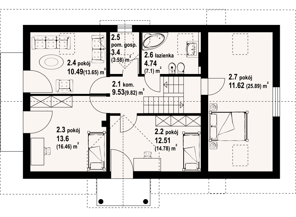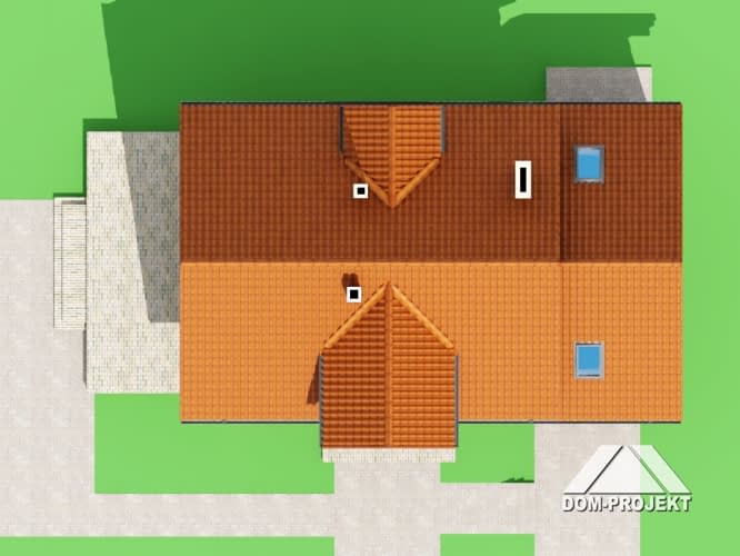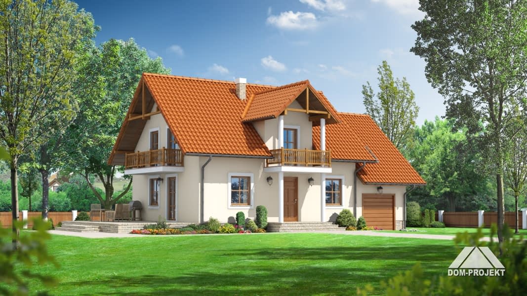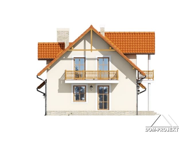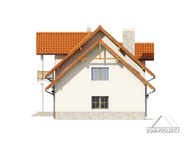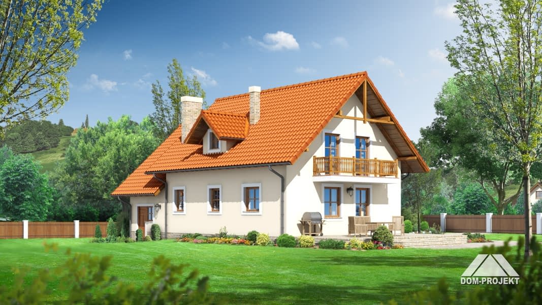 Dom z poddaszem użytkowym i dodatkową częścią gospodarczą. Prosta, symetryczna architektura. Przemyślane proporcje pomieszczeń. Zwarta bryła budynku zapewnia niskie koszty budowy i eksploatacji.Rzuty