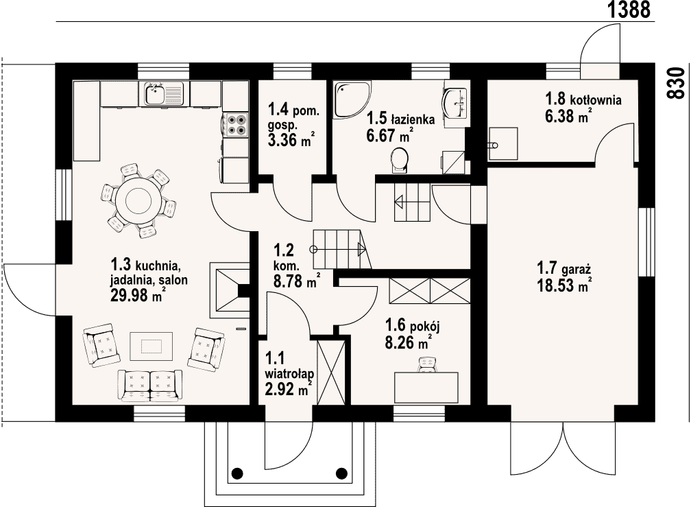 - 1.3 - kuchnia,jadalnia,salon29.98 m²