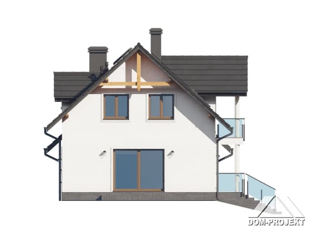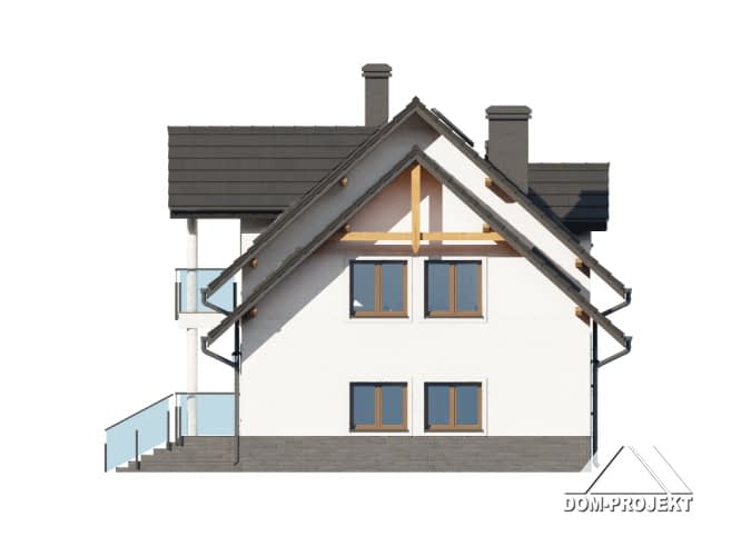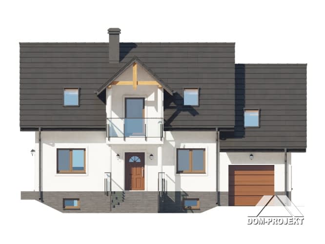 Dom z poddaszem użytkowym. Podpiwniczony. Na parterze salon z kuchnią, kominkiem oraz wyjściem na taras. Pokój, łazienka, komunikacja, wiatrołap, spiżarka, garaż, pomieszczenie gospodarcze. Na poddaszu cztery pokoje, łazienka, komunikacja oraz balkon. W podpiwniczeniu kotłownia, komunikacja, oraz dwie piwnice. Zwarta bryła budynku oraz dach dwuspadowy sprzyjają szybkiej i taniej budowie oraz niskim kosztom eksploatacji.Rzuty
