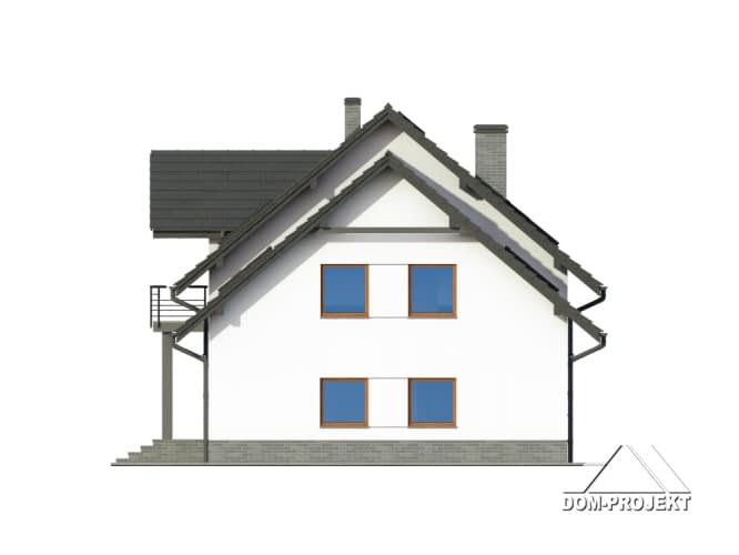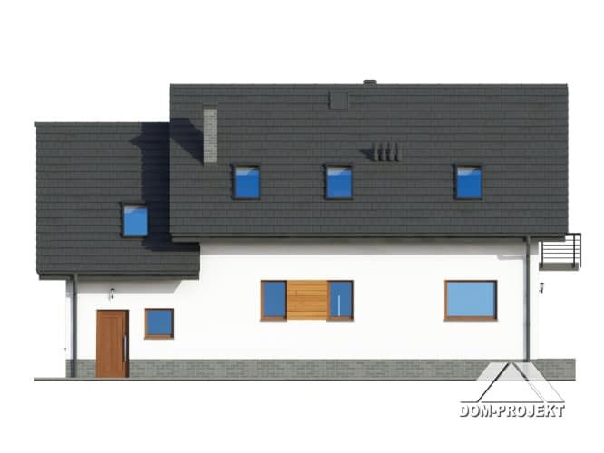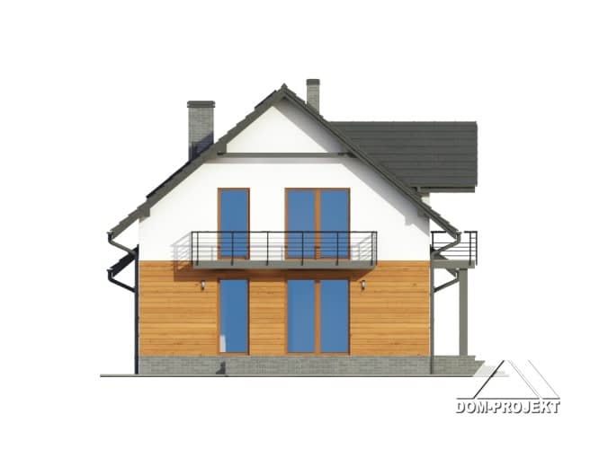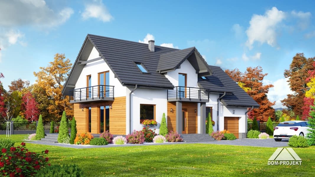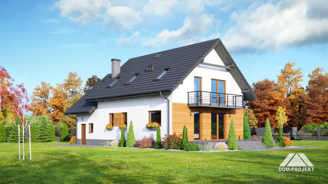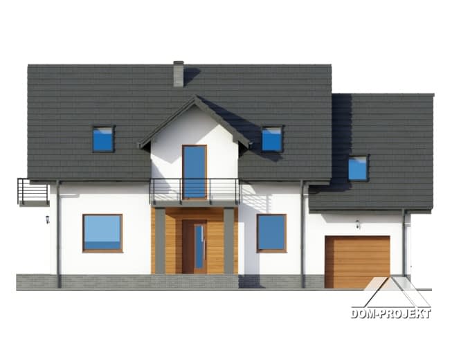 Dom z garażem i poddaszem użytkowym. Duży salon z aneksem kuchennym, kominkiem i wyjściem na taras. Pokój, łazienka, spiżarka, wiatrołap i komunikacja. Garaż i kotłownia. Na poddaszu trzy pokoje (każdy z balkonem), łazienka i wc. Strych (łatwo może być wykorzystany na cele mieszkalne). Zwarta bryła budynku i dach dwuspadowy sprzyjają szybkiej i taniej budowie i niskim kosztom eksploatacji.Rzuty