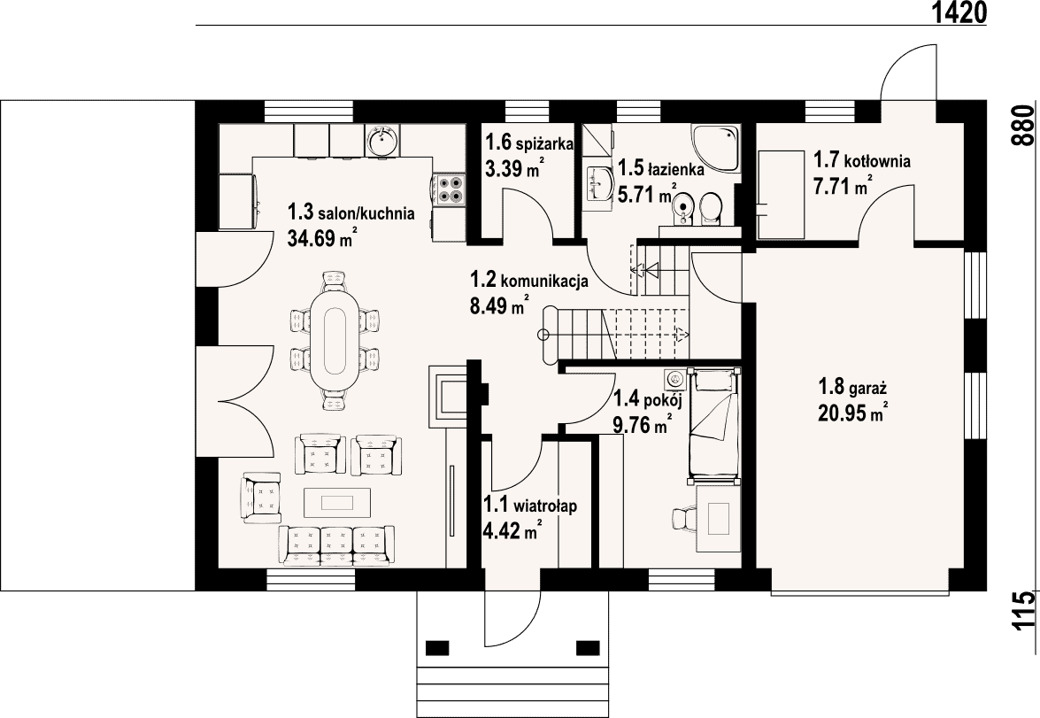- 1.3 - kuchnia, salon34.69 m²
