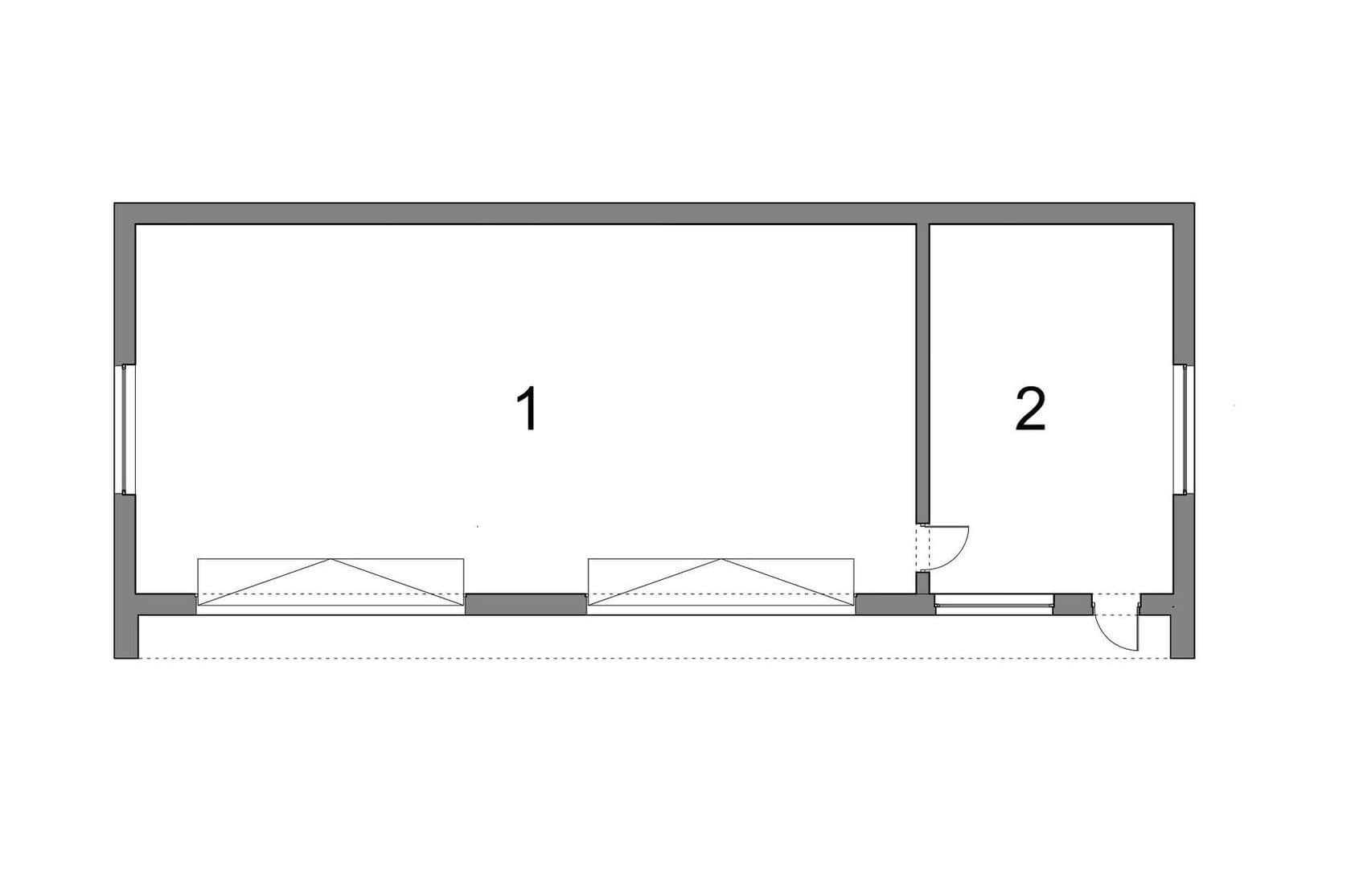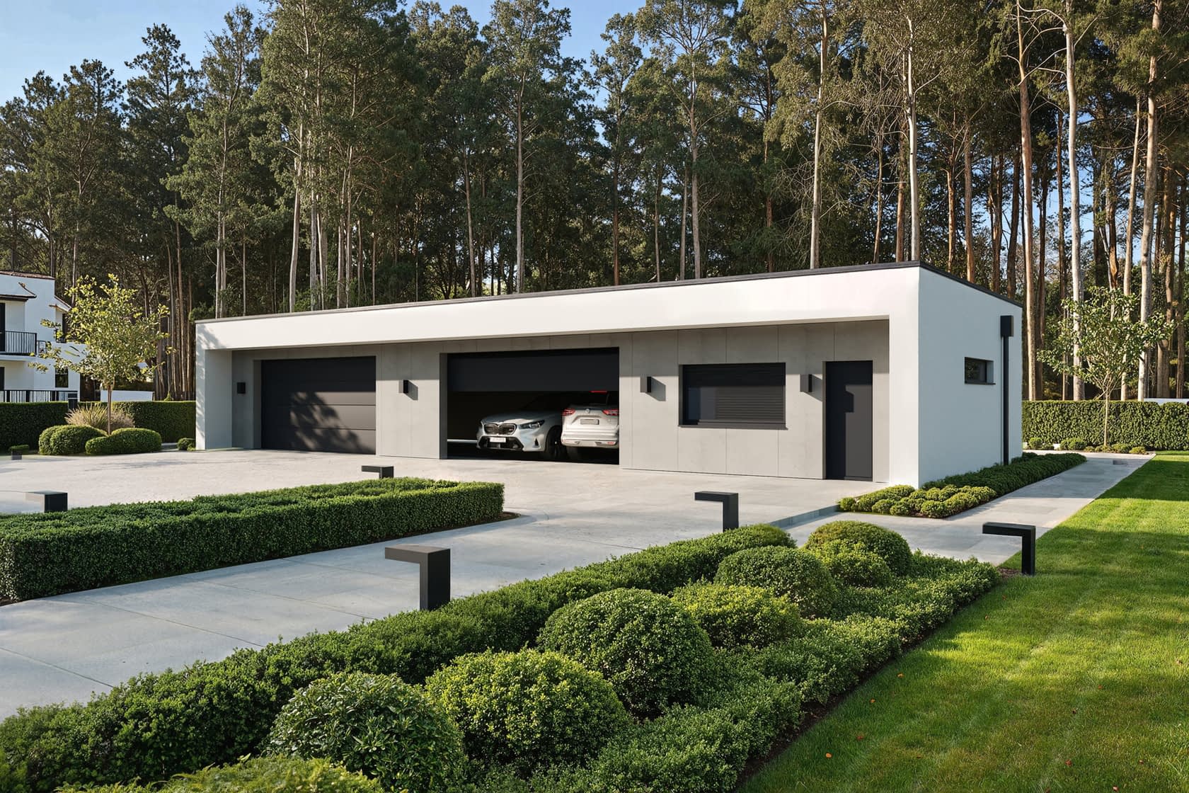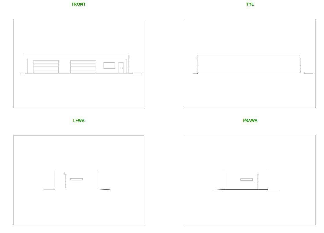Nowoczesny parterowy budynek gospodarczy z płaskim dachem. W zamierzeniu projekt nawiązuje swoją stylistyką do oferowanych przez nas projektów domów, poprzez charakterystyczną ramę w części frontowej oraz wykończenie tynkami cienkowarstwowymi w kolorze białym oraz imitacją betonu.