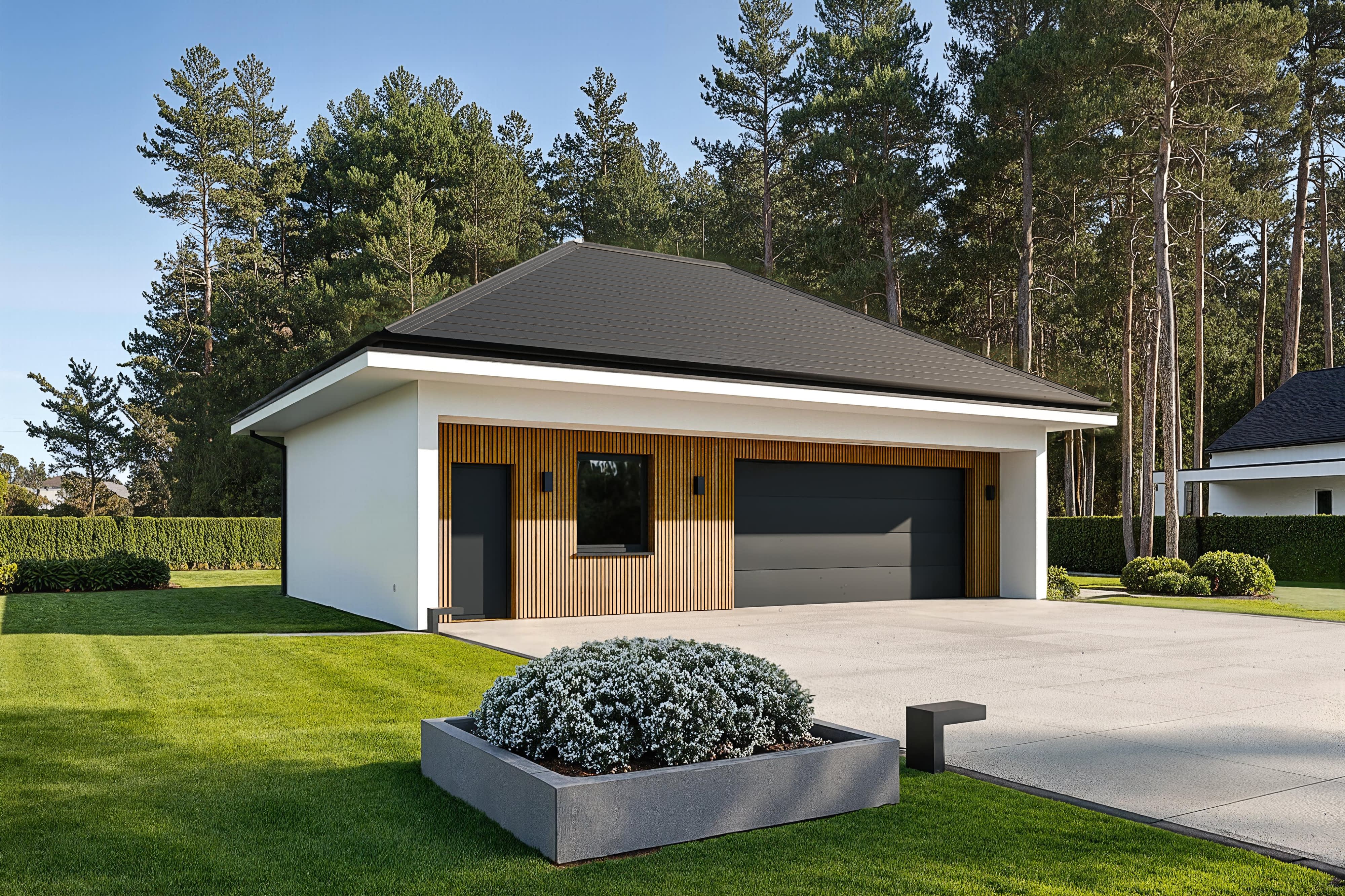 Nowoczesny budynek gospodarczy z dwoma pomieszczeniami gospodarczymi.