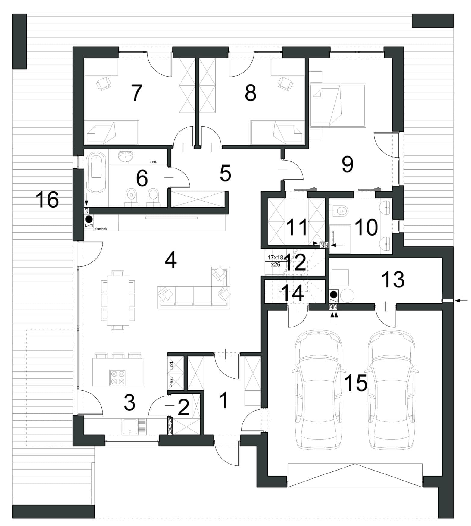 Układ domu to 3 wydzielone strefy: dzienna w postaci salonu i otwartej kuchni ze spiżarnią, nocna w której zaprojektowano 3 sypialnie, z czego sypialnia gospodarzy z łazienką i garderobą i łazienka przeznaczona dla pozostałych domowników oraz strefa techniczna obejmująca dwustanowiskowy garaż, kotłownię i pomieszczenie techniczne z dostępem z zewnątrz.