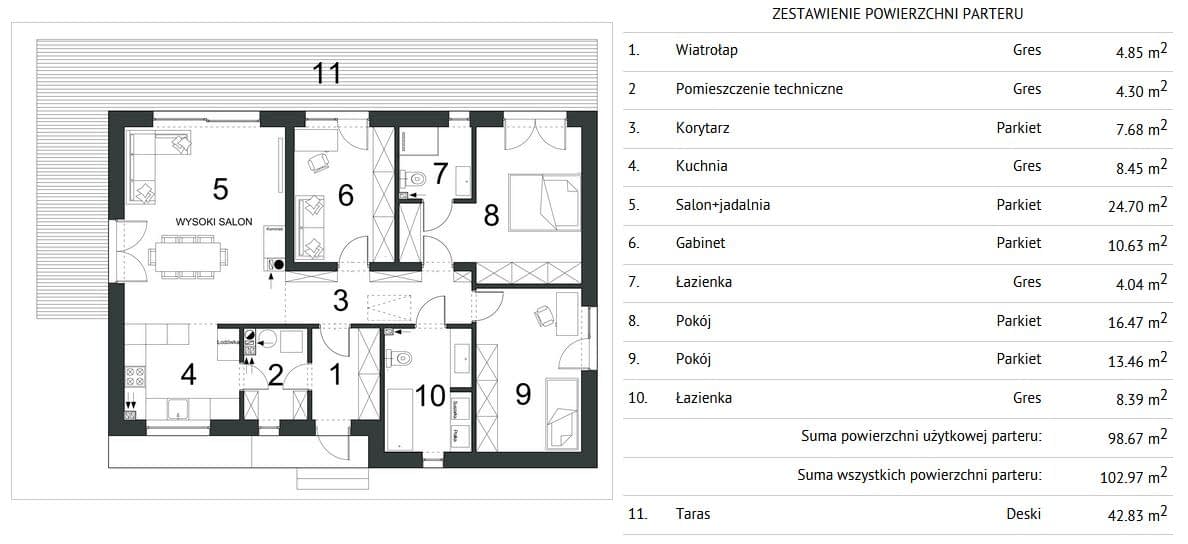 Każdy nasz projekt typowy składa się z 3 egzemplarzy projektu architektoniczno-budowlanego oraz 3 egzemplarzy projektu technicznego. Projekty opracowane zostały zgodnie z Warunkami Technicznymi 2021 oraz dostosowane do Eurokodów.