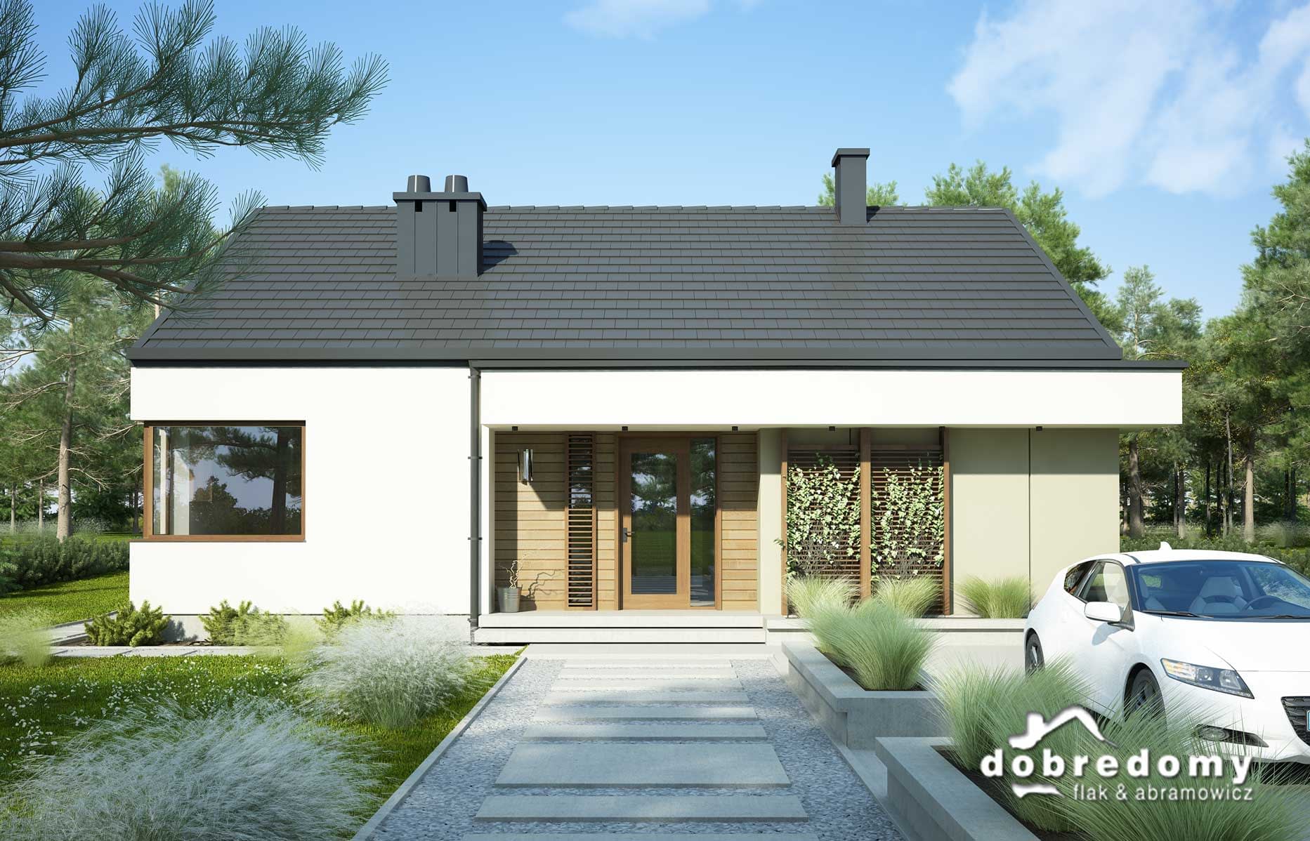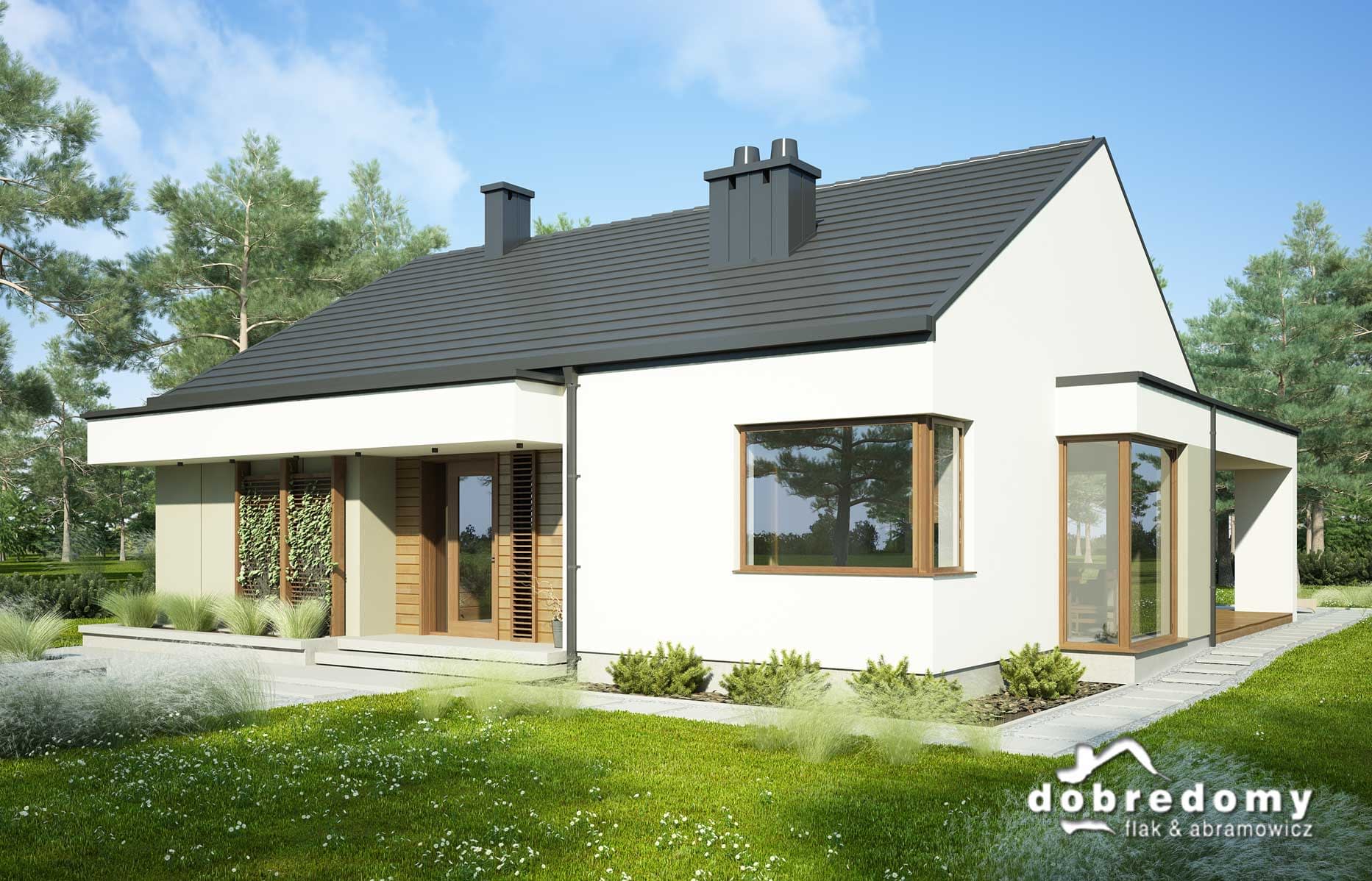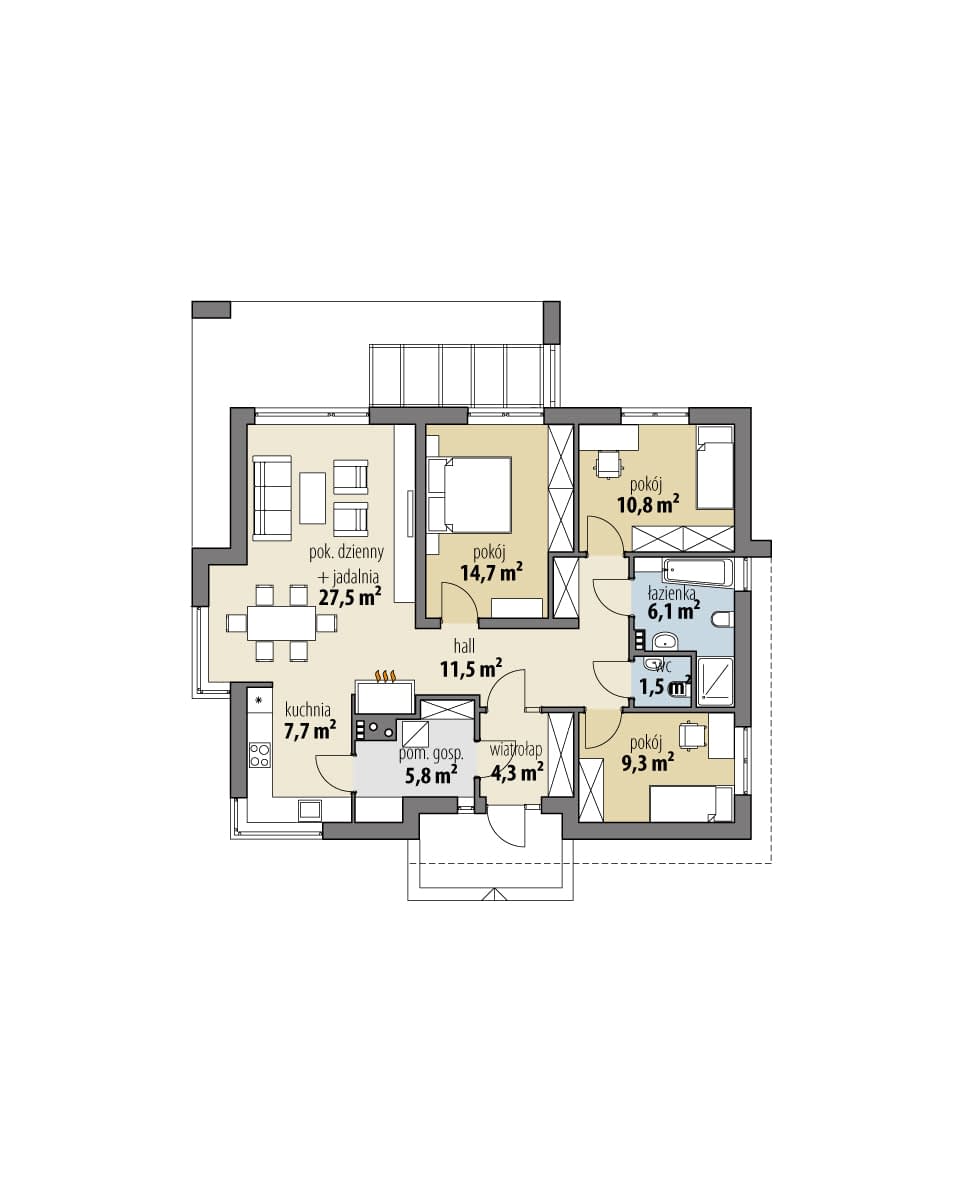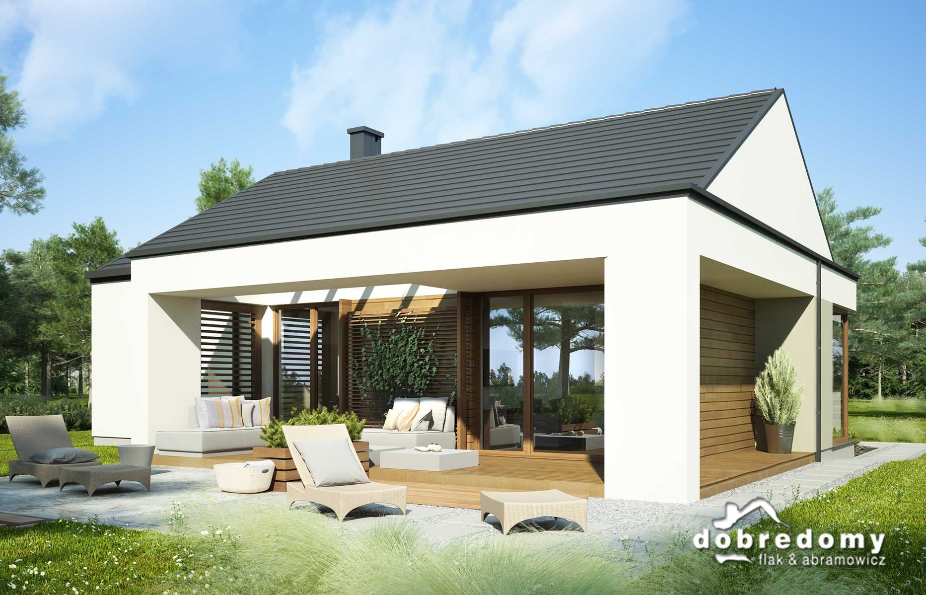 Nowoczesny dom parterowy, przeznaczony dla 4-5-osobowej rodziny. W części ogólnodostępnej zlokalizowano pokój dzienny połączony z jadalnią i kuchnią. Część prywatną tworzą trzy sypialnie oraz łazienka i wc. Pomieszczenie gospodarcze umieszczone tuż przy wejściu dostępne jest również z kuchni.