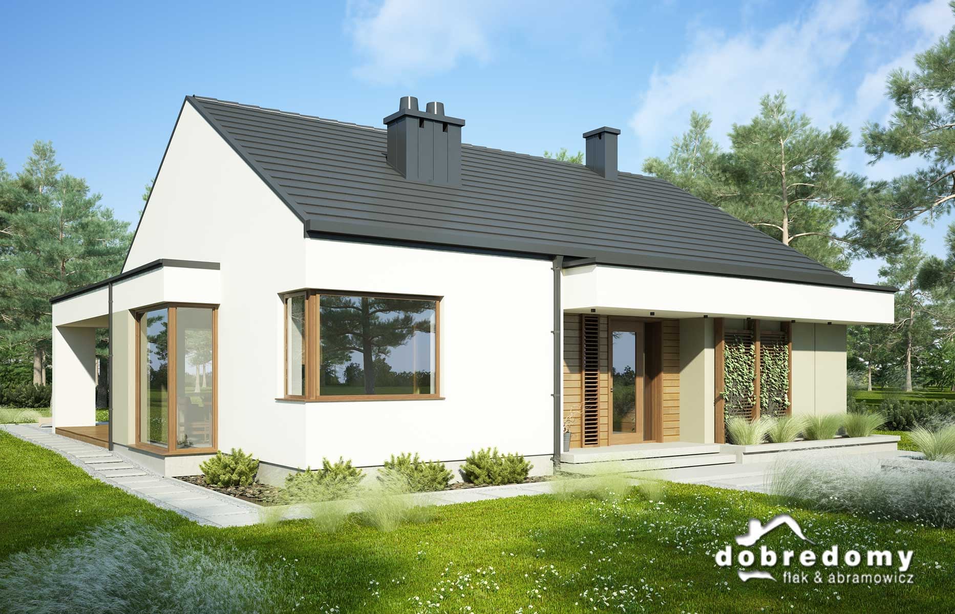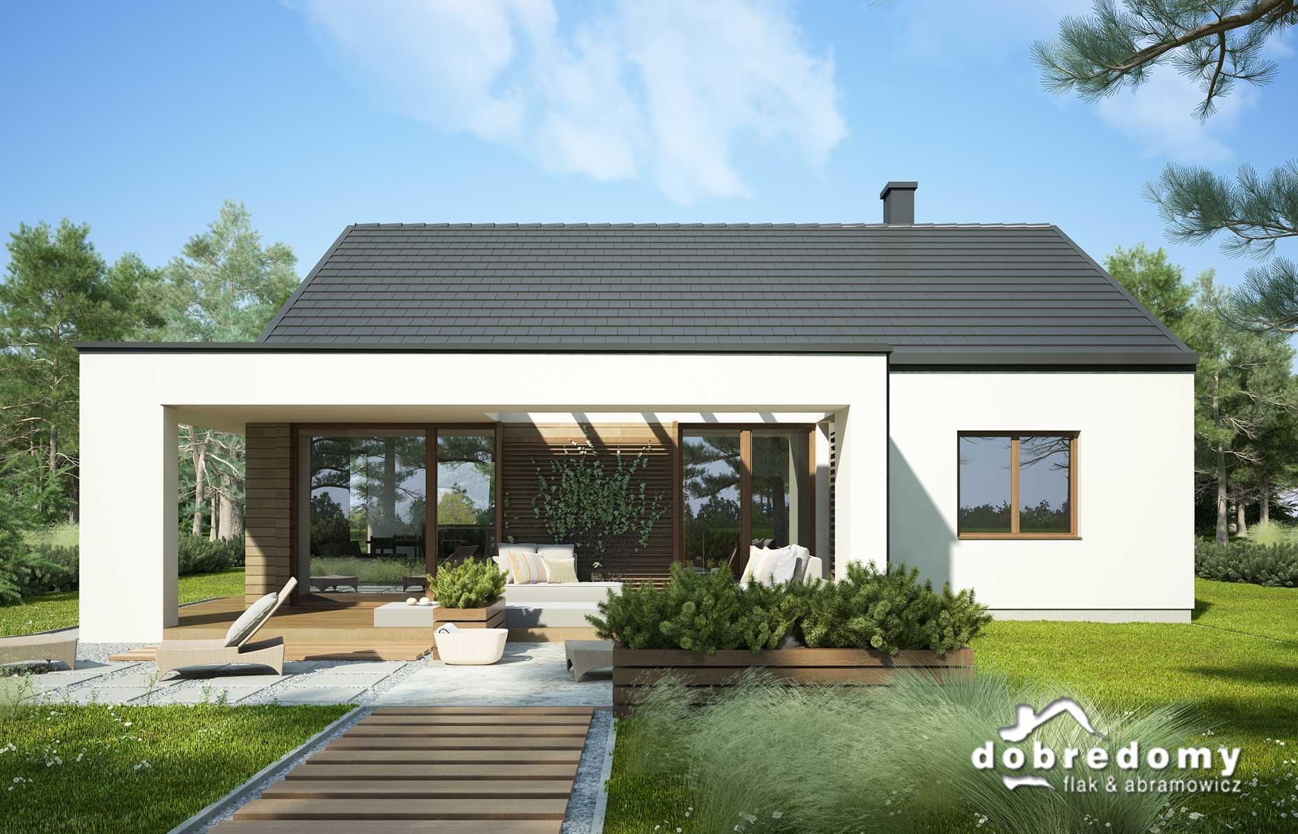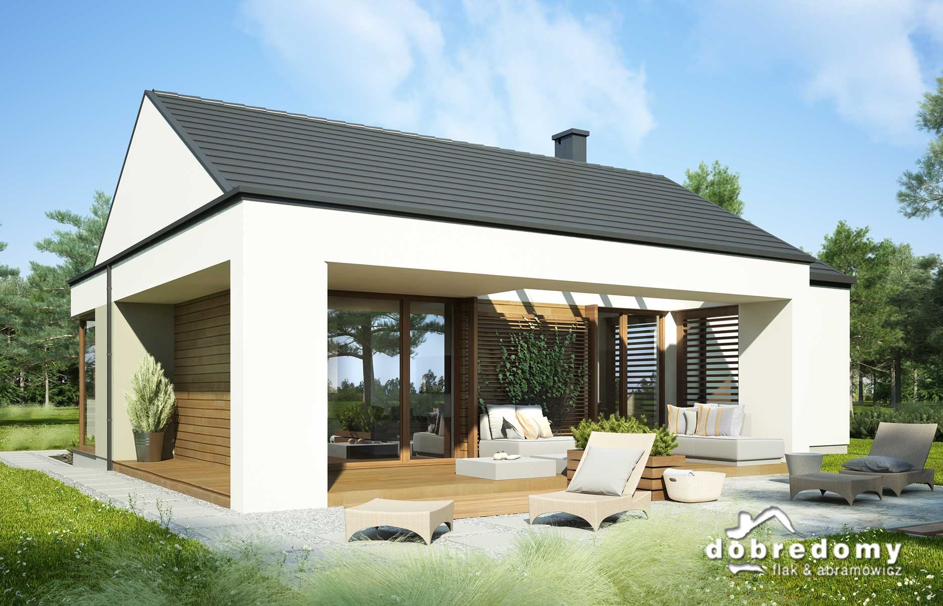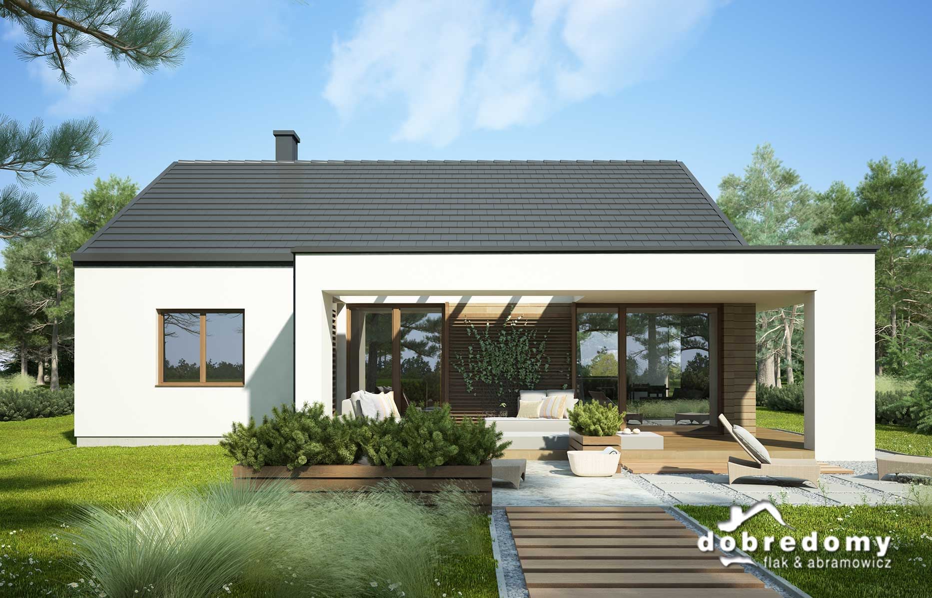 Nowoczesny dom parterowy, przeznaczony dla 4-5-osobowej rodziny. W części ogólnodostępnej zlokalizowano pokój dzienny połączony z jadalnią i kuchnią. Część prywatną tworzą trzy sypialnie oraz łazienka i wc. Pomieszczenie gospodarcze umieszczone tuż przy wejściu dostępne jest również z kuchni.