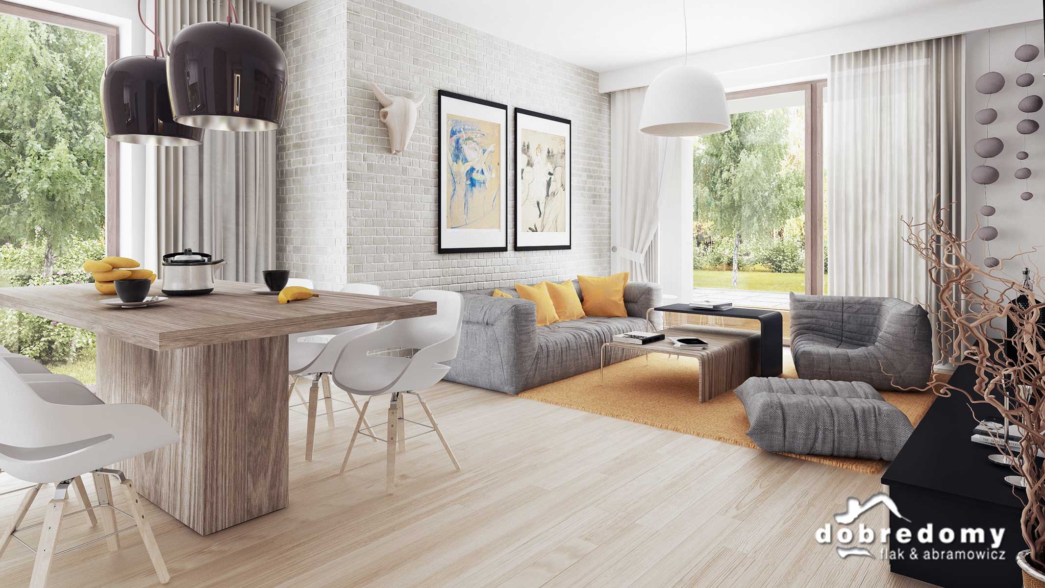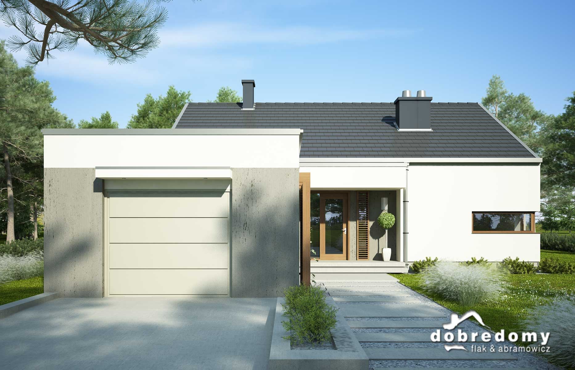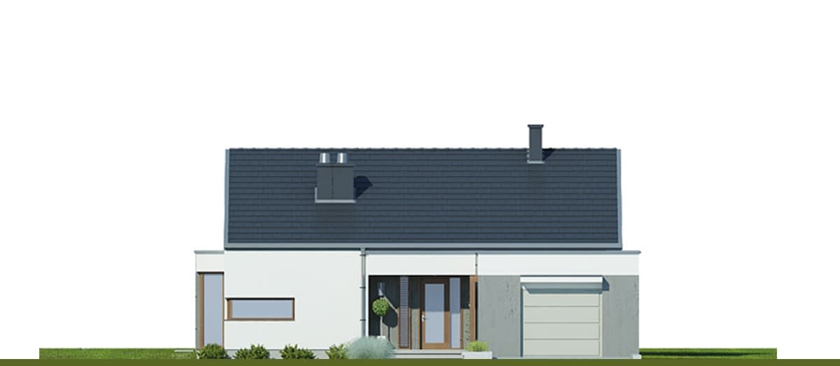 Nowoczesny dom parterowy, przeznaczony dla 4-5-osobowej rodziny. W części ogólnodostępnej zlokalizowano pokój dzienny połączony z jadalnią i kuchnią. Część prywatną tworzą trzy sypialnie oraz łazienka i wc. Pomieszczenie gospodarcze umieszczone tuż przy wejściu dostępne jest również z kuchni. Całości dopełnia garaż jednostanowiskowy.