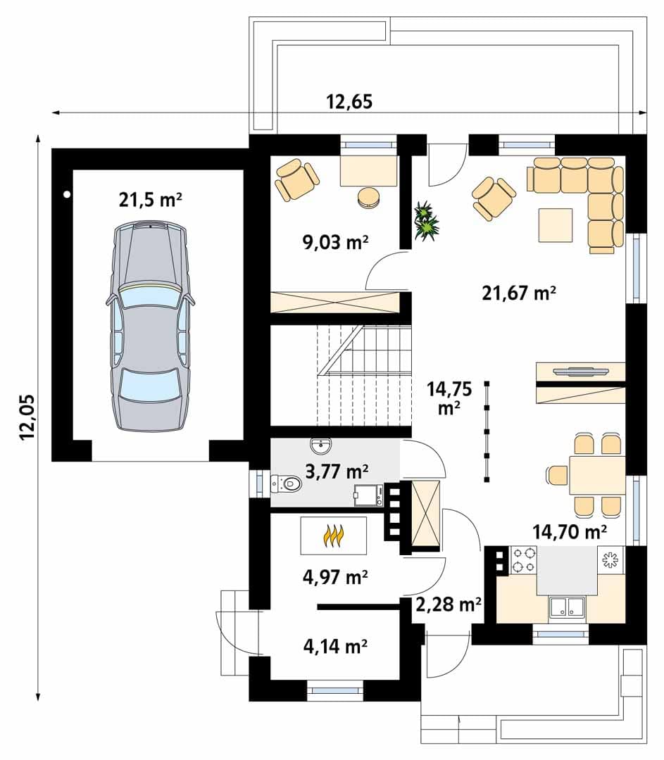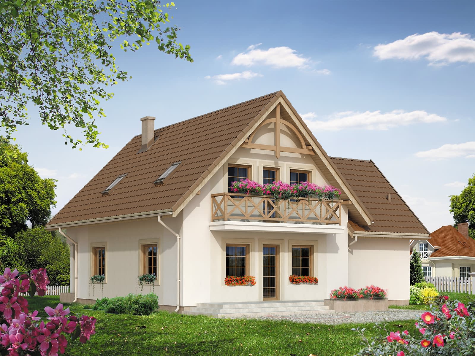Dom jednorodzinny z użytkowym poddaszem i garażem, zaprojektowany dla dużej rodziny. Na parterze znajdziemy dodatkowy pokój. Na poddaszu zaprojektowano aż pięć sypialni, łazienkę oraz garderobę.Konstrukcja