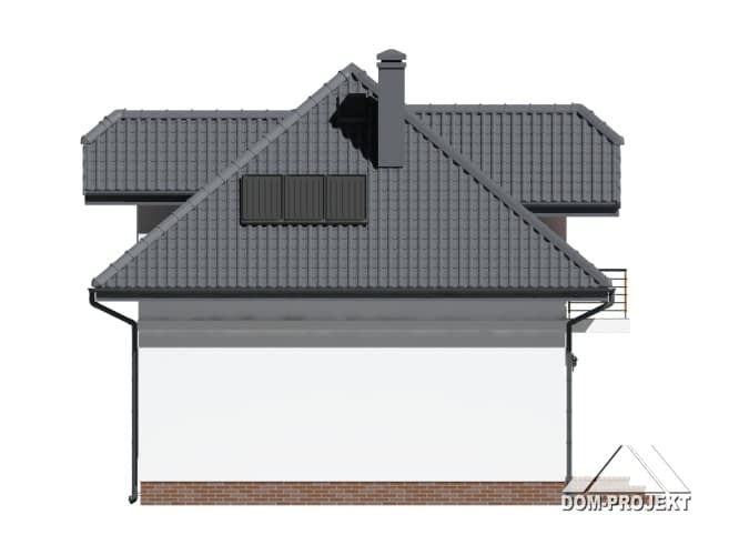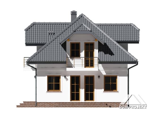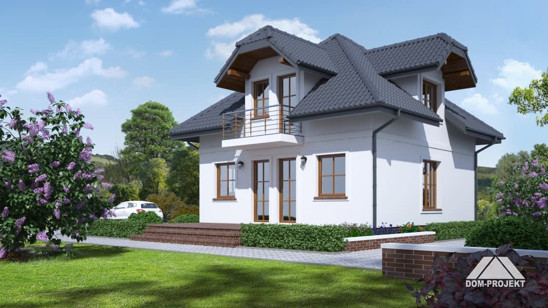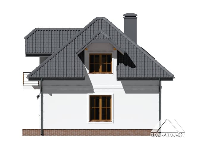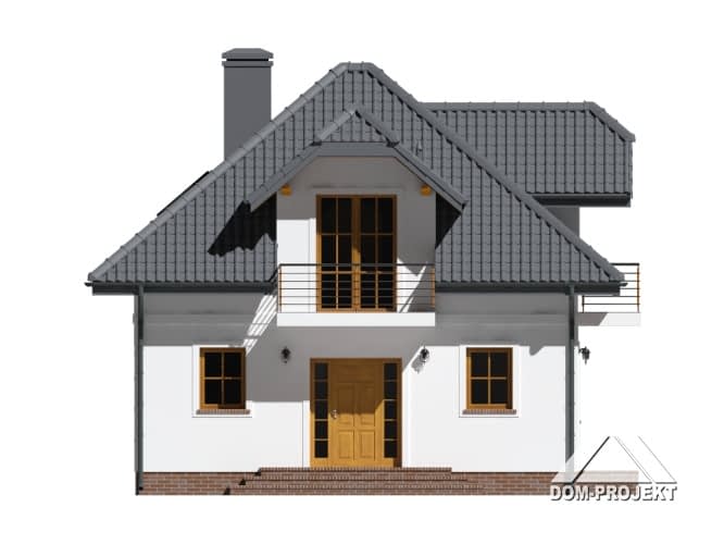 Niewielki dom z poddaszem użytkowym. Prosta bryła przykryta dachem wielospadowym z lukarnami. Na parterze salon połączony z kuchnią, schody na poddasze z salonu, łazienka. Na poddaszu trzy pokoje, łazienka.Rzuty