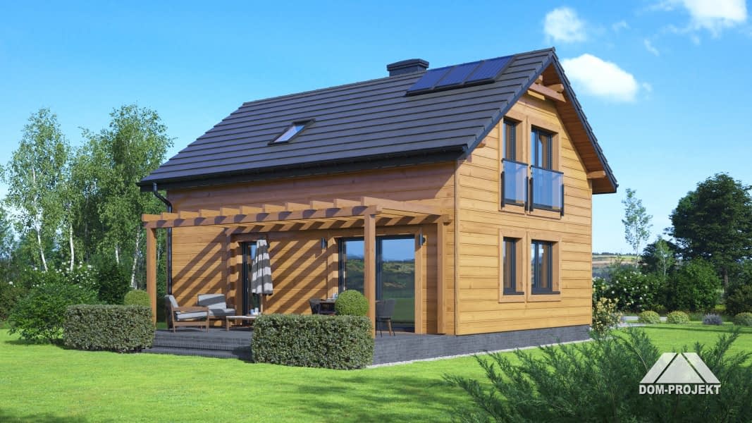 Dom w konstrukcji szkieletu drewnianego. Na parterze salon z aneksem kuchennym, kominkiem, oraz wyjściem na taras. Pokój, wiatrołap, wc z piecem gazowym. Na poddaszu trzy pokoje, łazienka, komunikacja. Zwarta bryła budynku oraz dach dwuspadowy sprzyjają szybkiej i taniej budowie oraz niskim kosztom eksploatacji.Rzuty